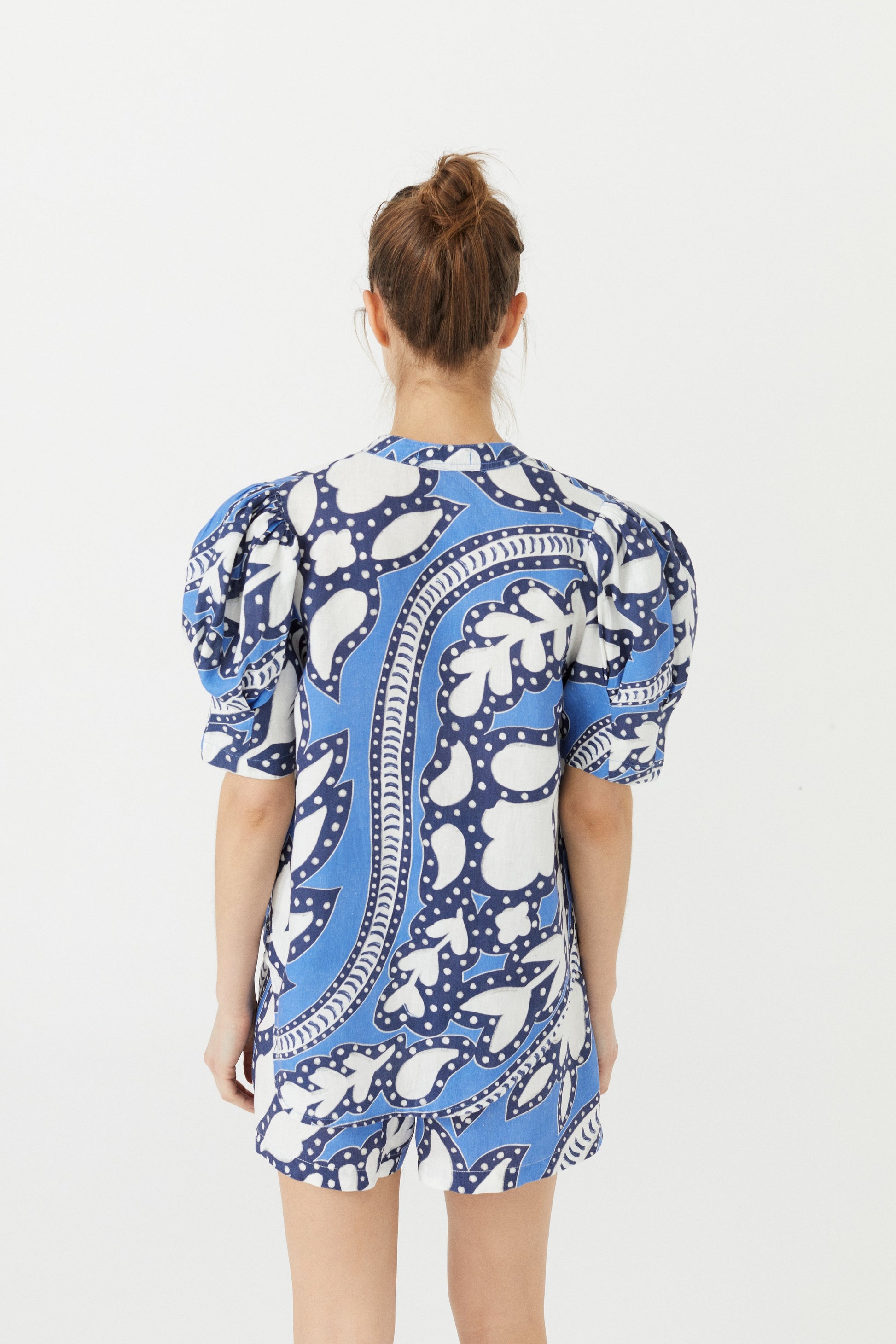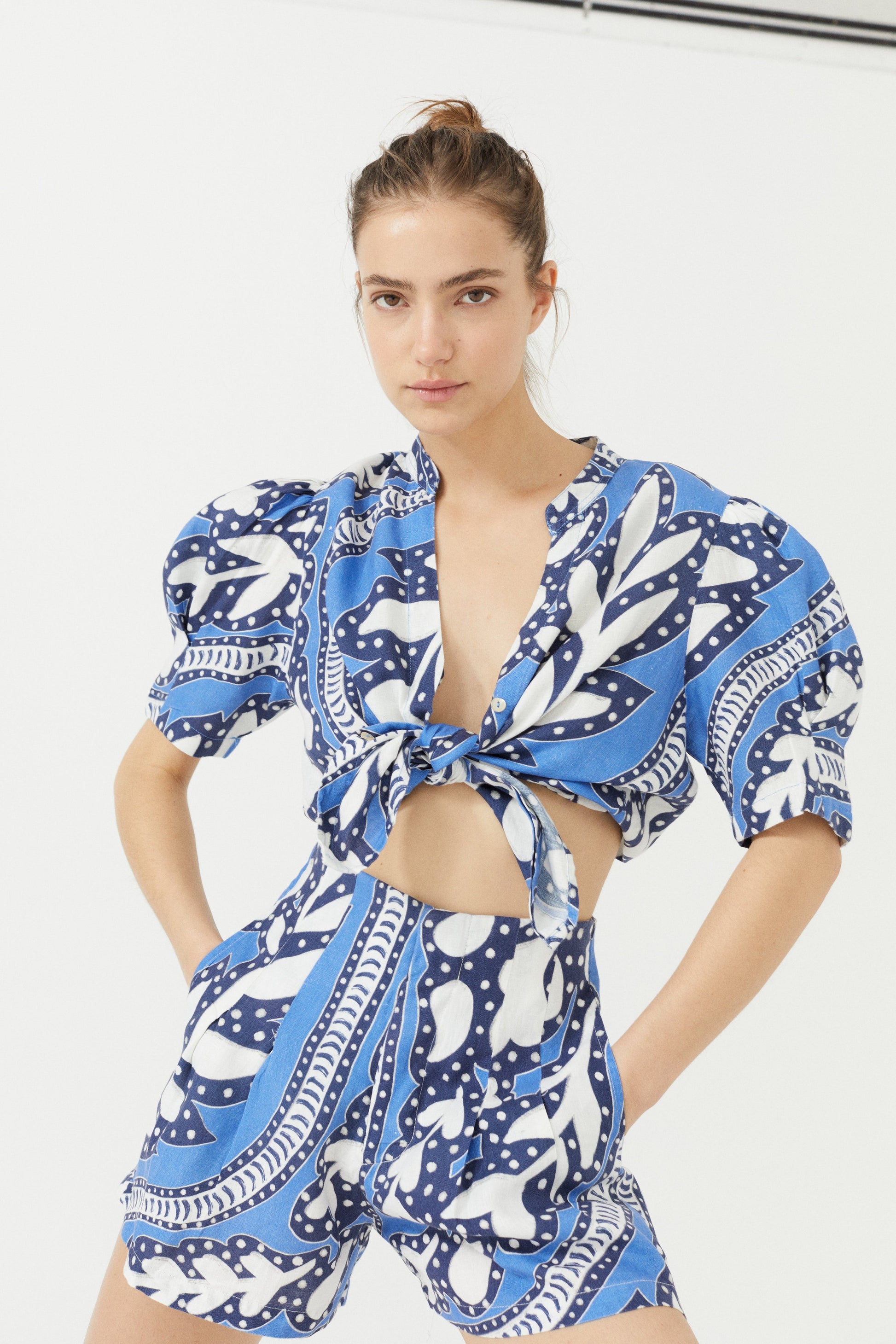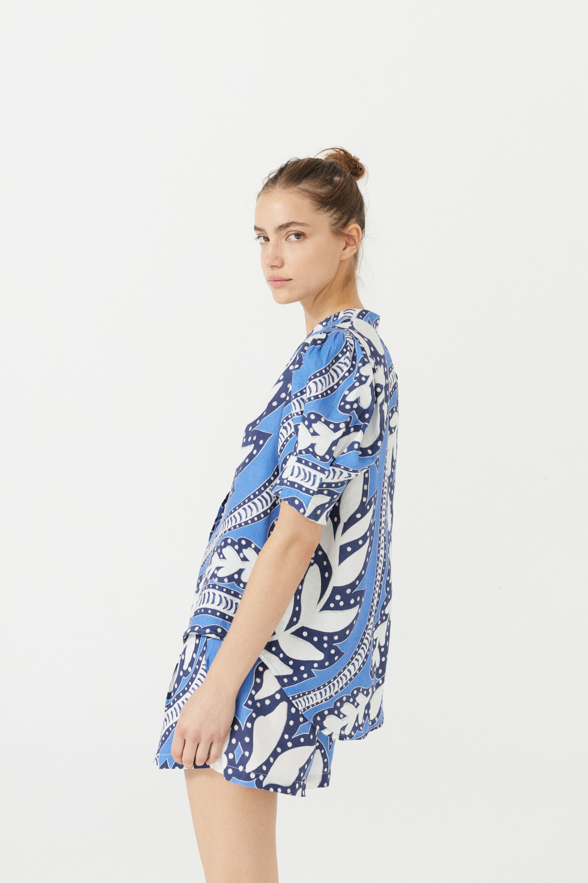 There’s nothing like a good linen shirt. The Athina is femenine, casual and elegant at the same time. Made with our premium 100% linen, it features puffed short sleeves and mao v-neck with shell buttons. Our exclusive Mykonos Print will take you straight to a perfect sunset on the Greek island.
