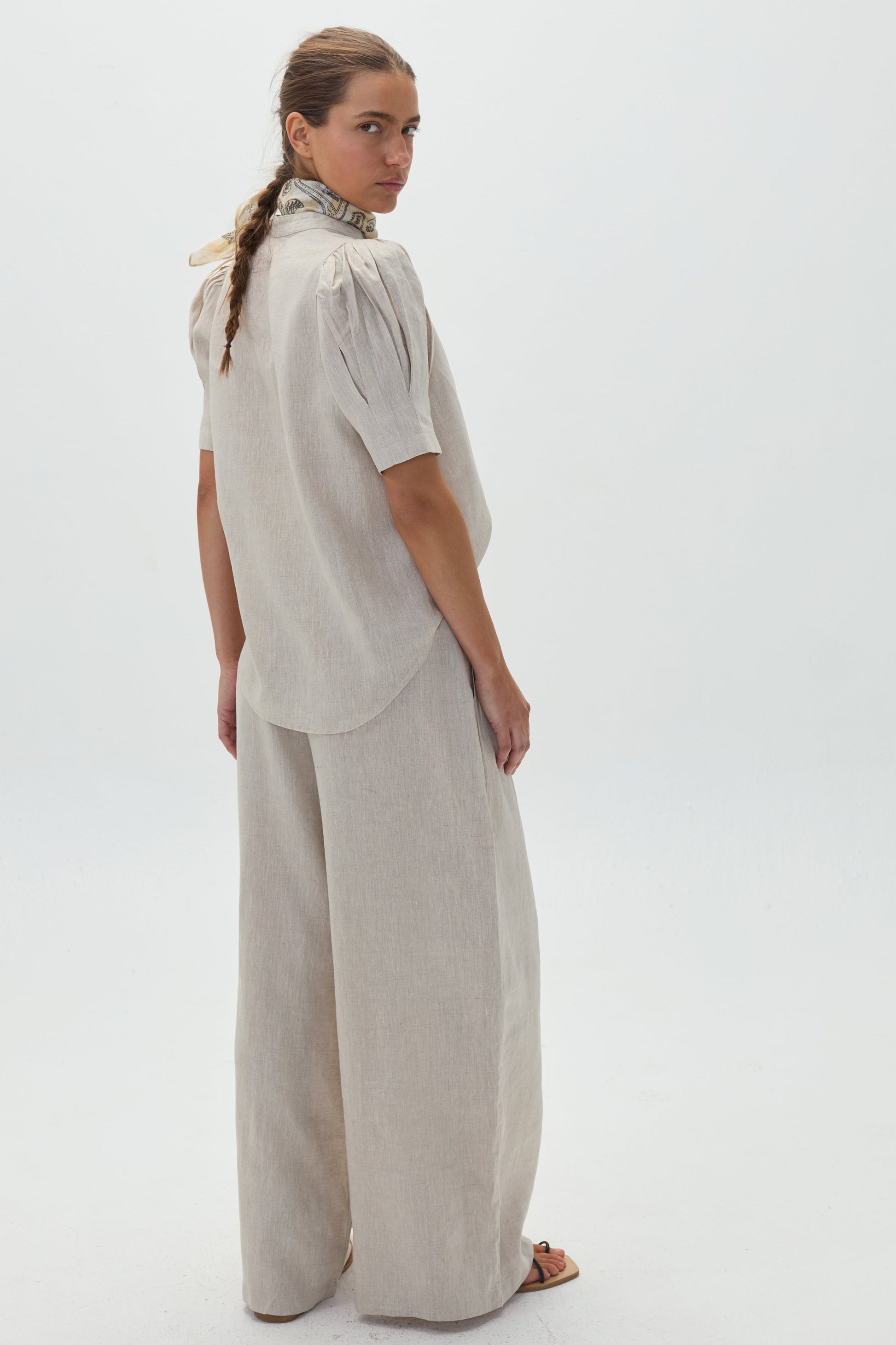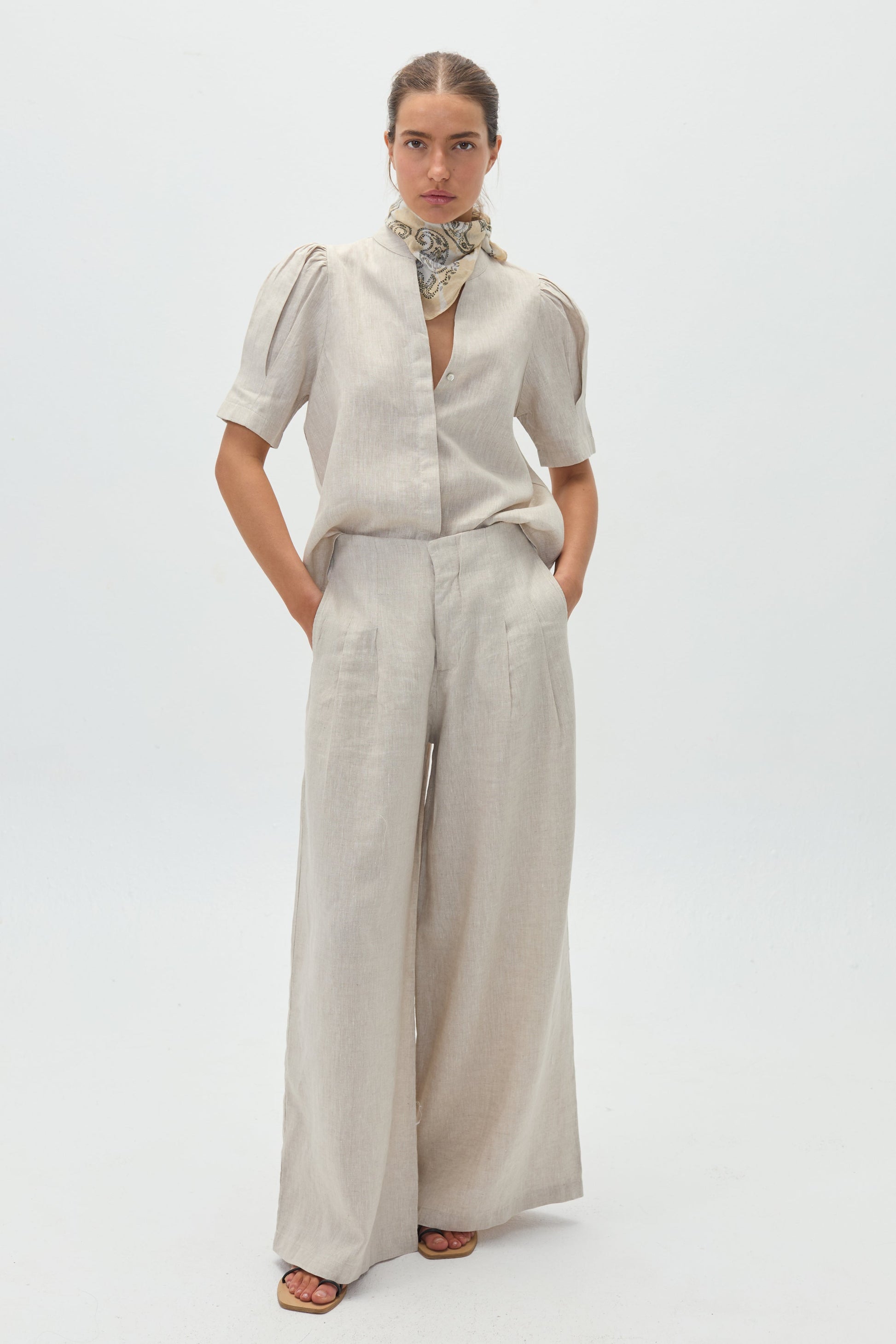 There’s nothing like a good linen shirt. The Athina is femenine, casual and elegant at the same time. Made with our premium 100% linen, it features puffed short sleeves and mao v-neck with shell buttons.
