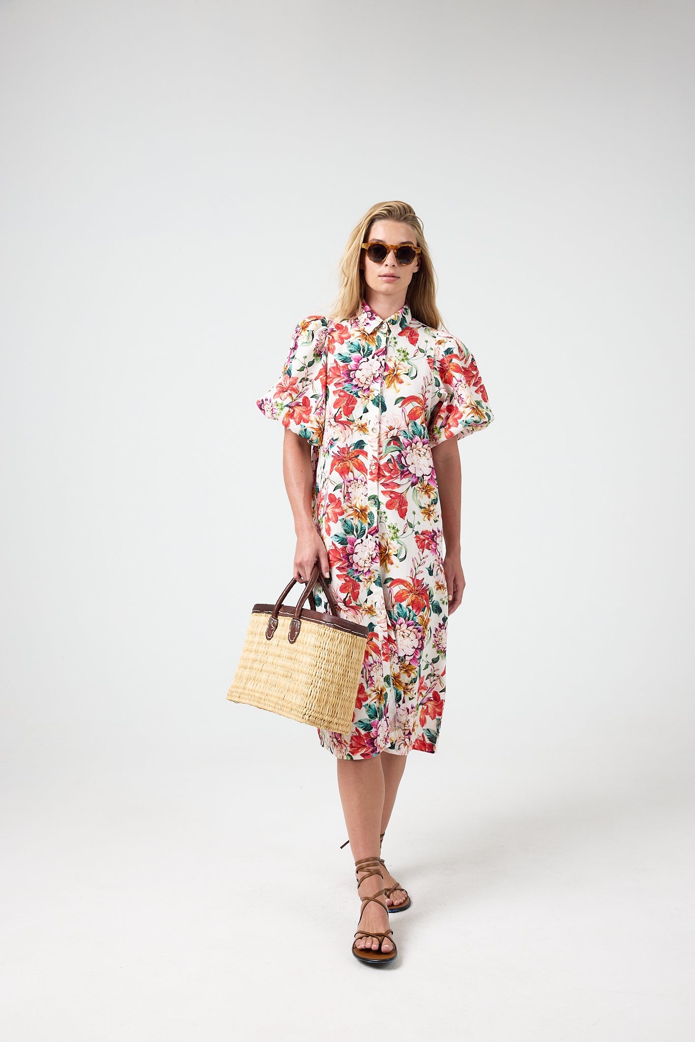 If you're seeking a feminine and comfortable dress, without a doubt we would recommend our Angel Dress. Crafted with our beloved 100% organic linen, it's pre-washed and softened for effortless care and a lovely drape. This midi-length linen dress has romantic puffed sleeves up to the elbow, a classic collar and shell buttons. Our Full Bloom Print is colorful and fun.