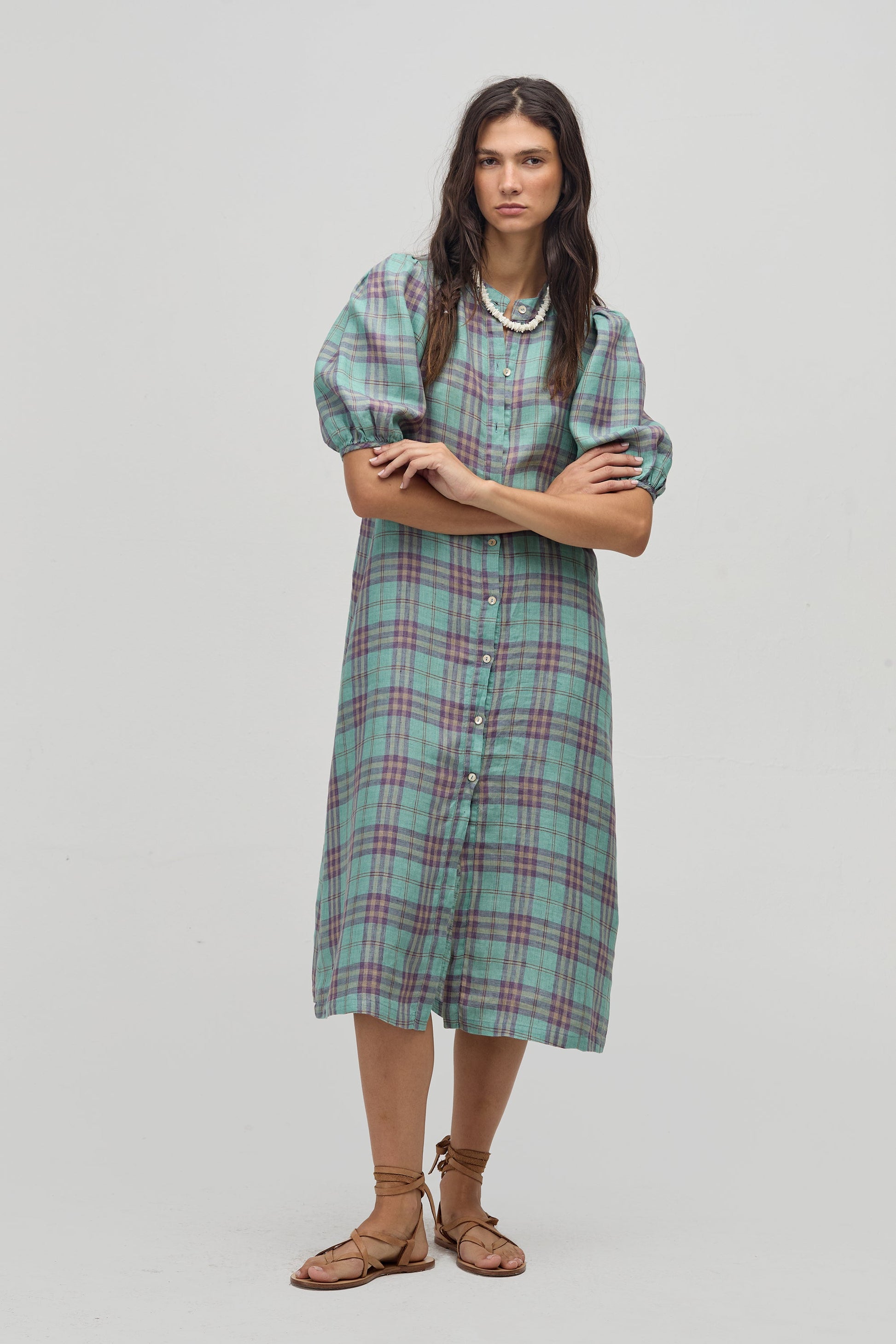 The Bubble dress made of 100% linen is a very flattering piece for any occasion. With a mao neck and puff sleeves that accentuate the A-line silhouette to create a feminine shape.