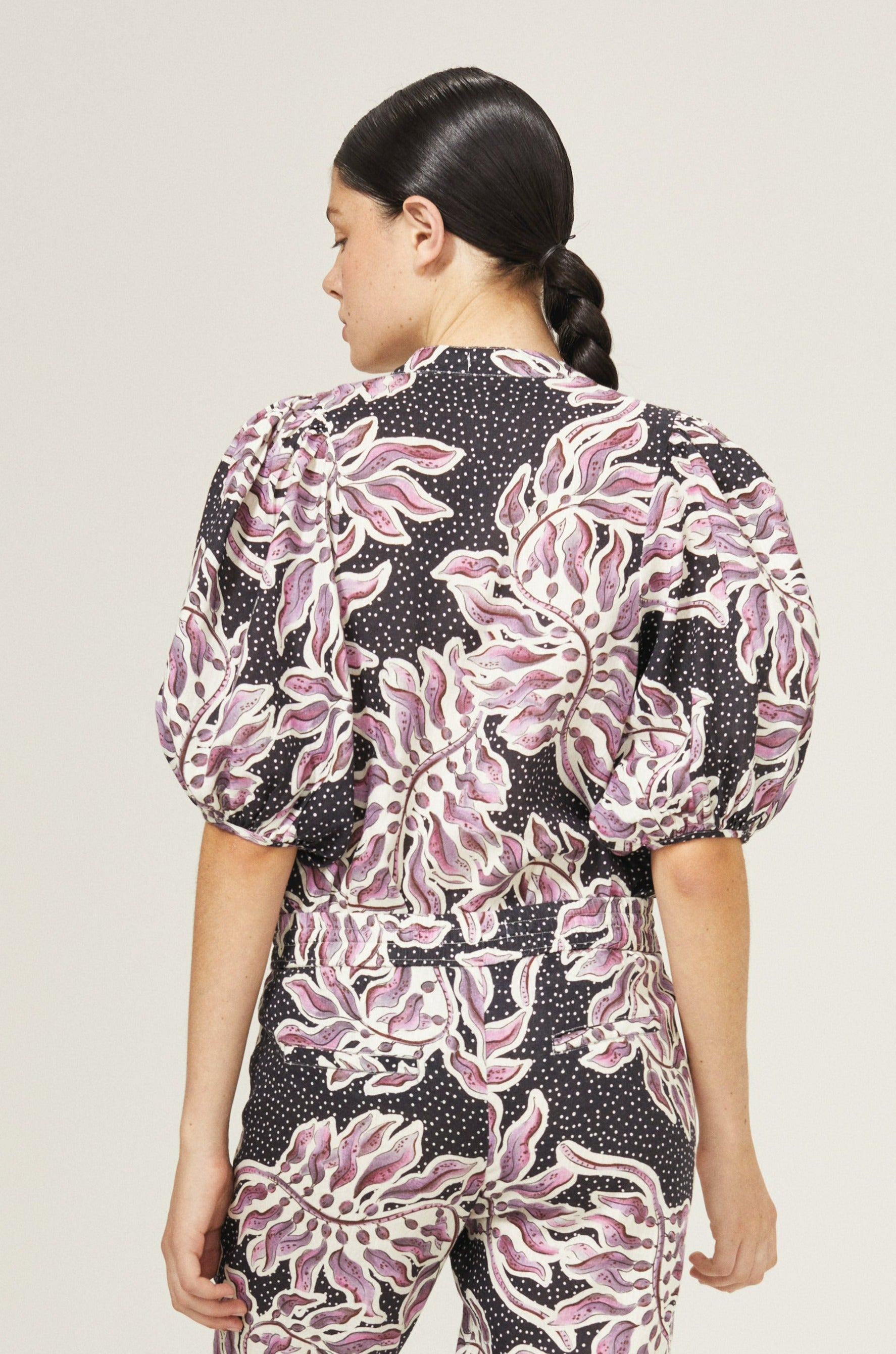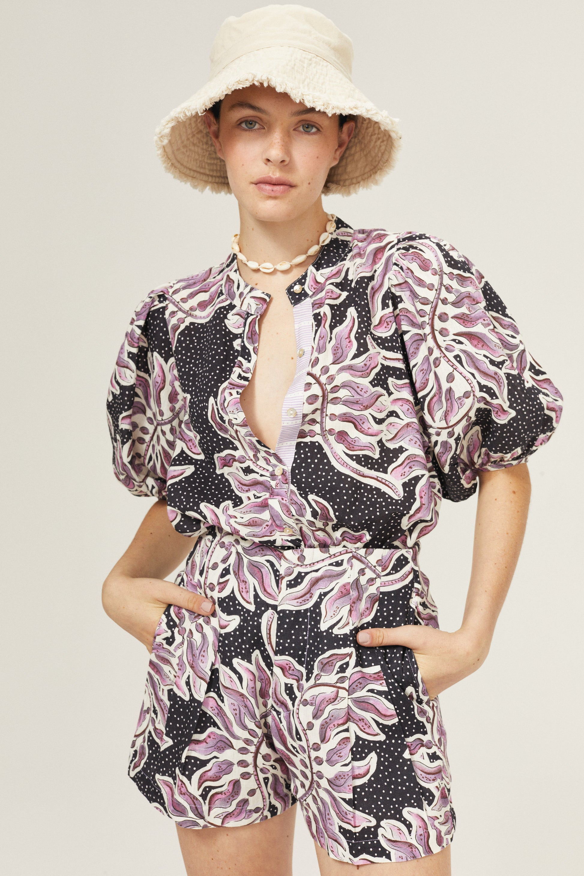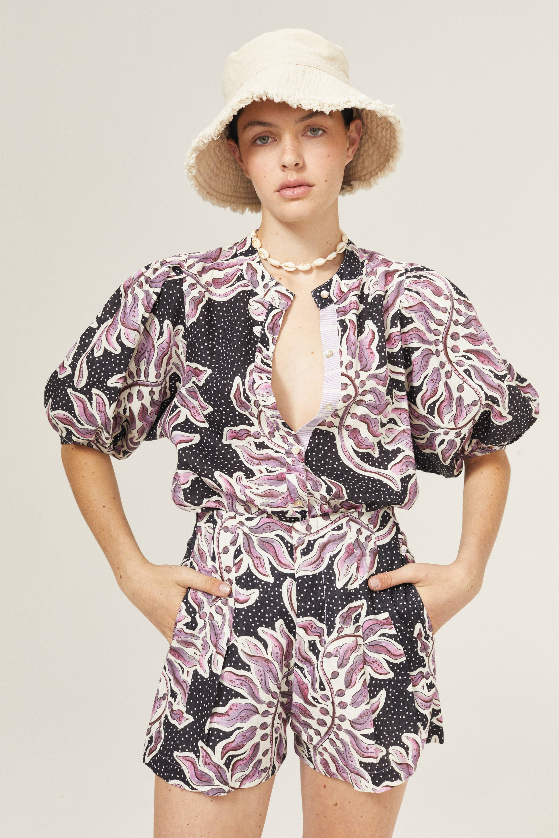 The Bubble linen top is a very feminine and flattering piece for any occasion. Features a mao neckline, button front closure, and puff sleeves. Paired it with the Luna pant, Elastic shorts, or your favorite jeans.