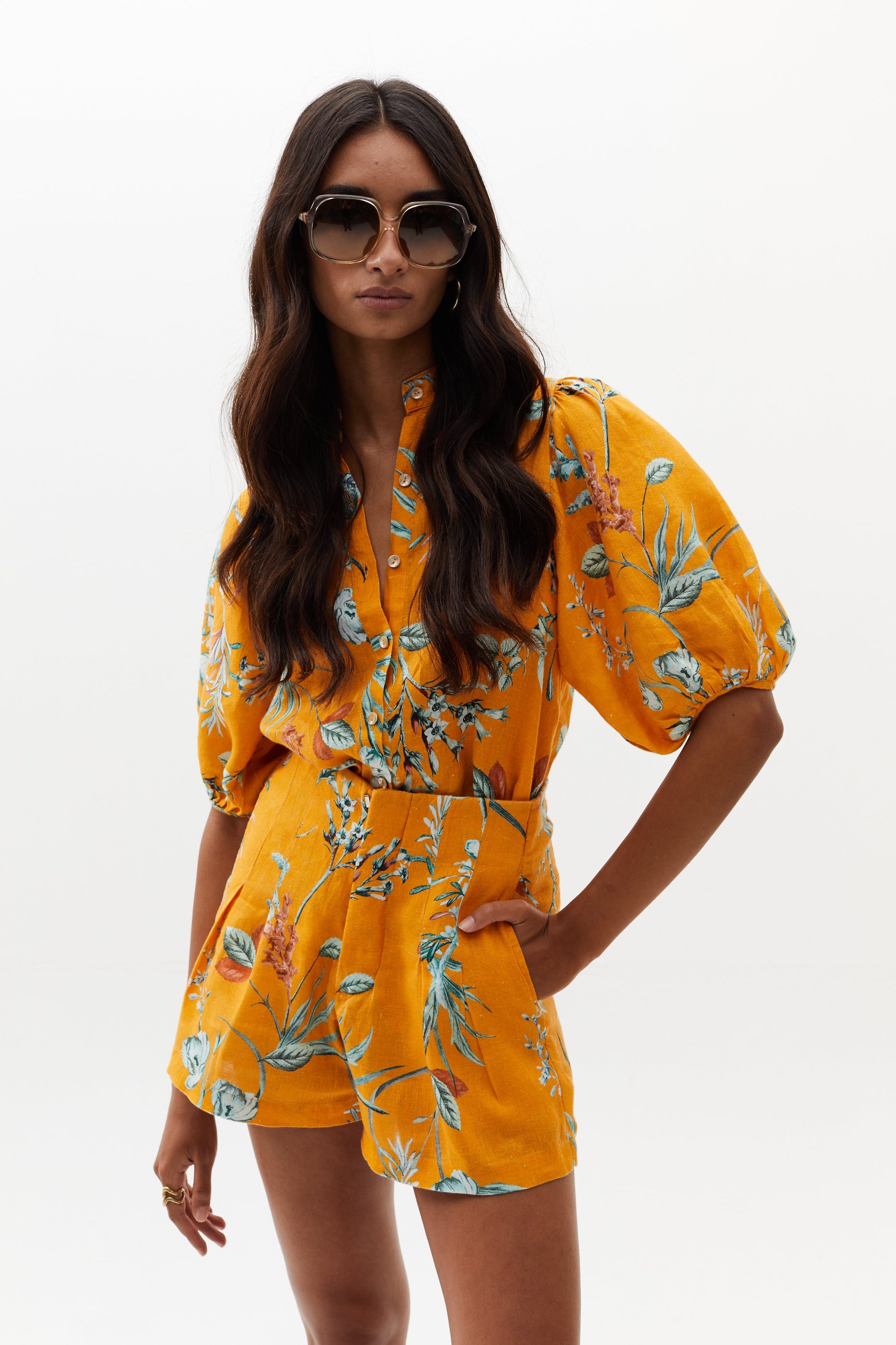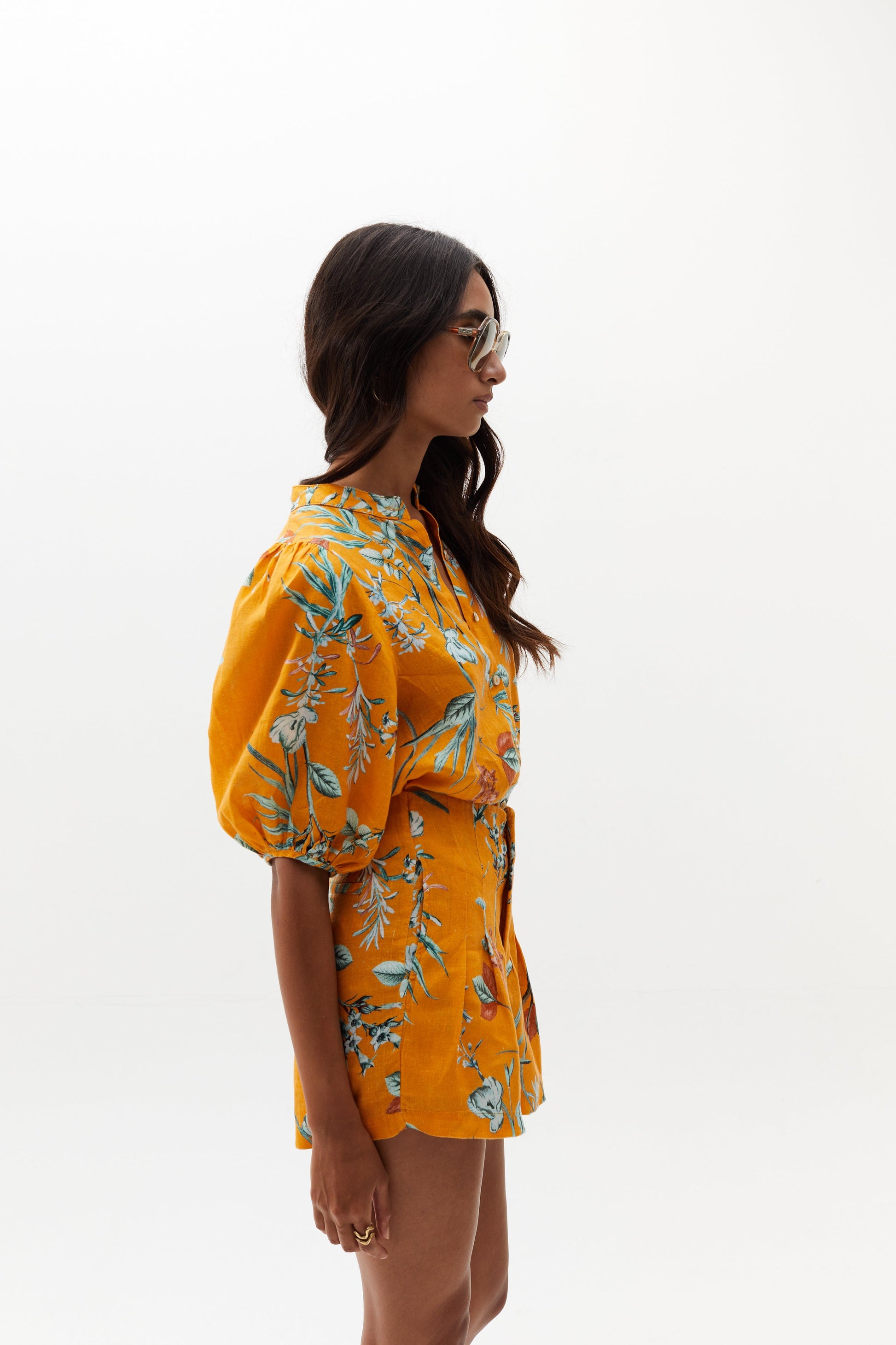 The Bubble linen top is a very feminine and flattering piece for any occasion. It features a mao neckline, button front closure, and puffed sleeves. Our exclusive Sunshine print makes it the perfect colorful, floral high summer style. Pair it with the Luna pants, Elastic shorts, or your favorite jeans.
