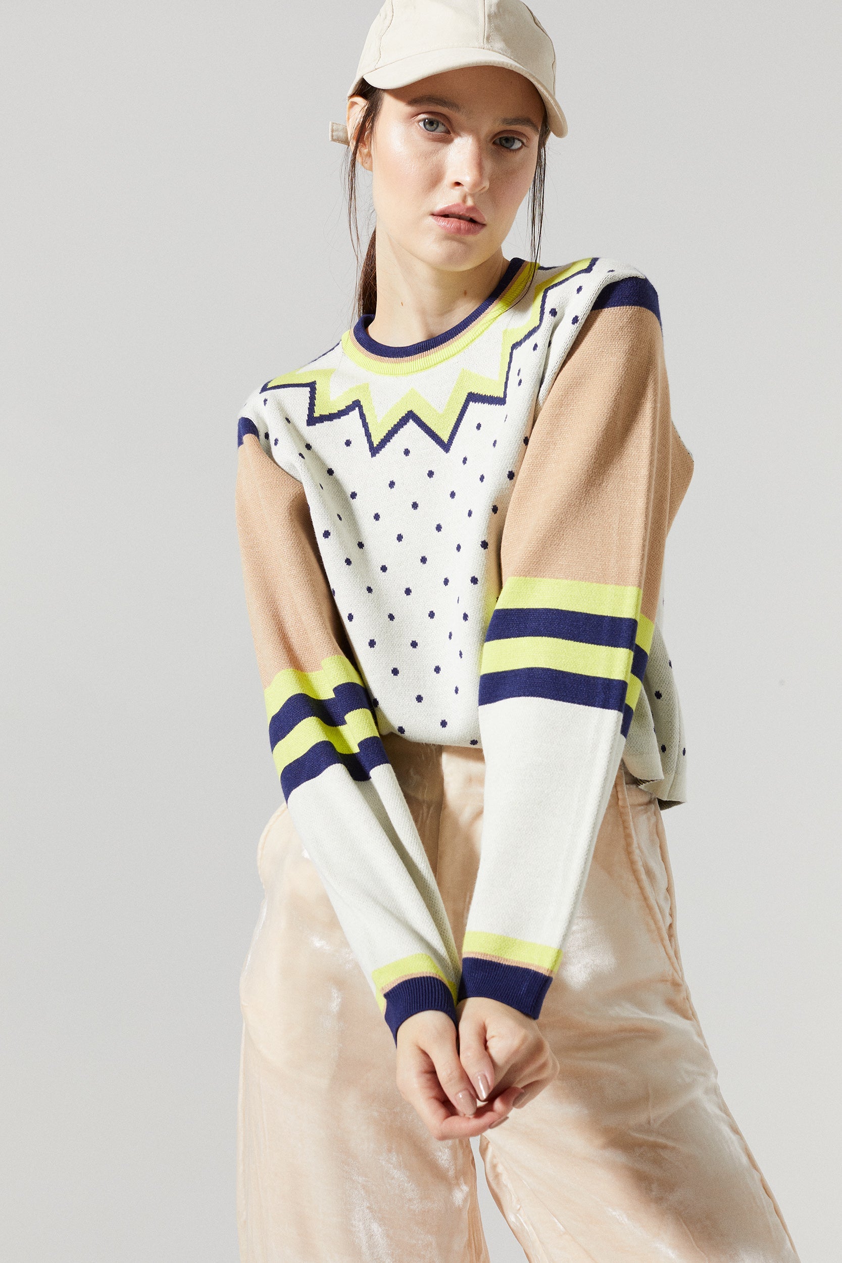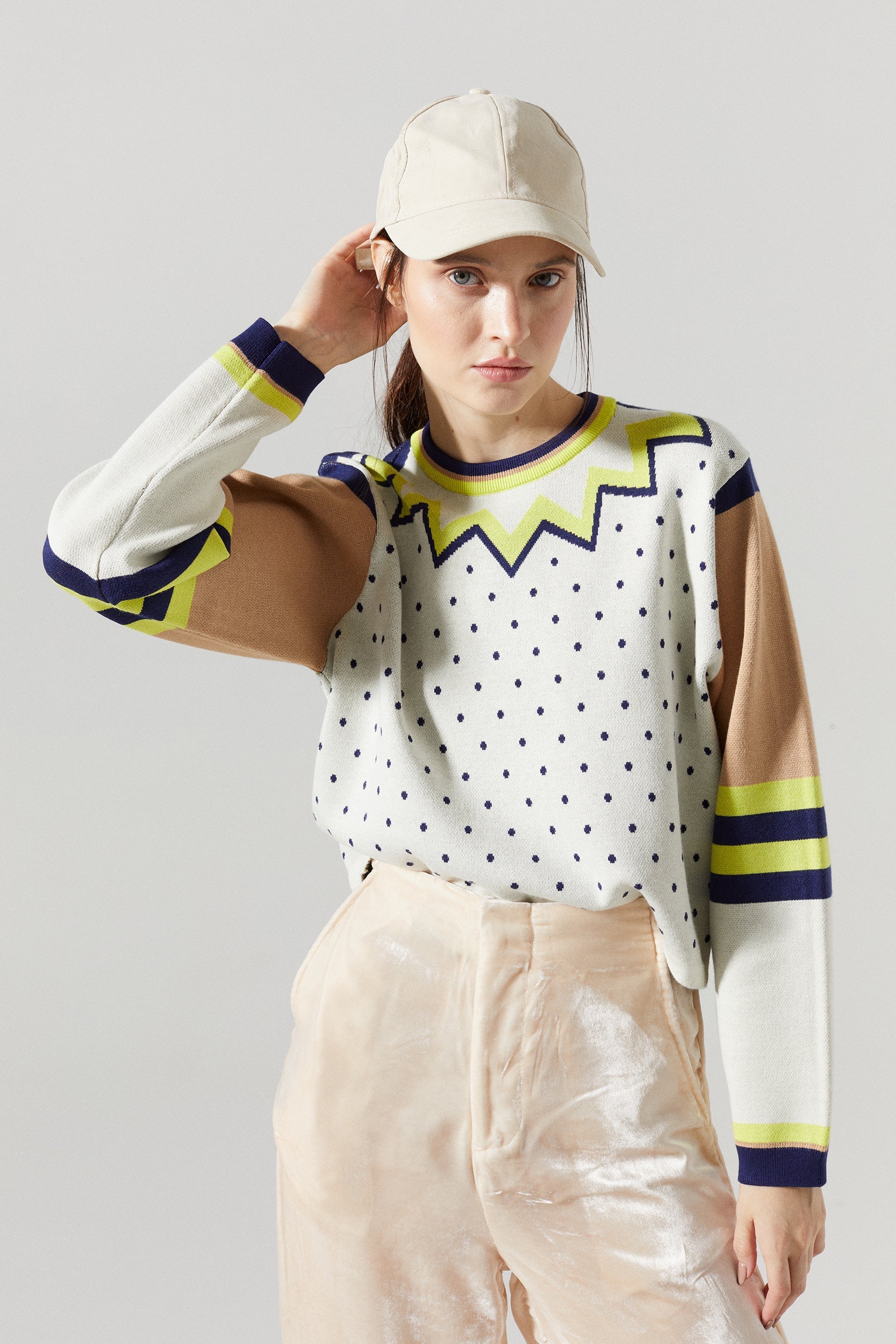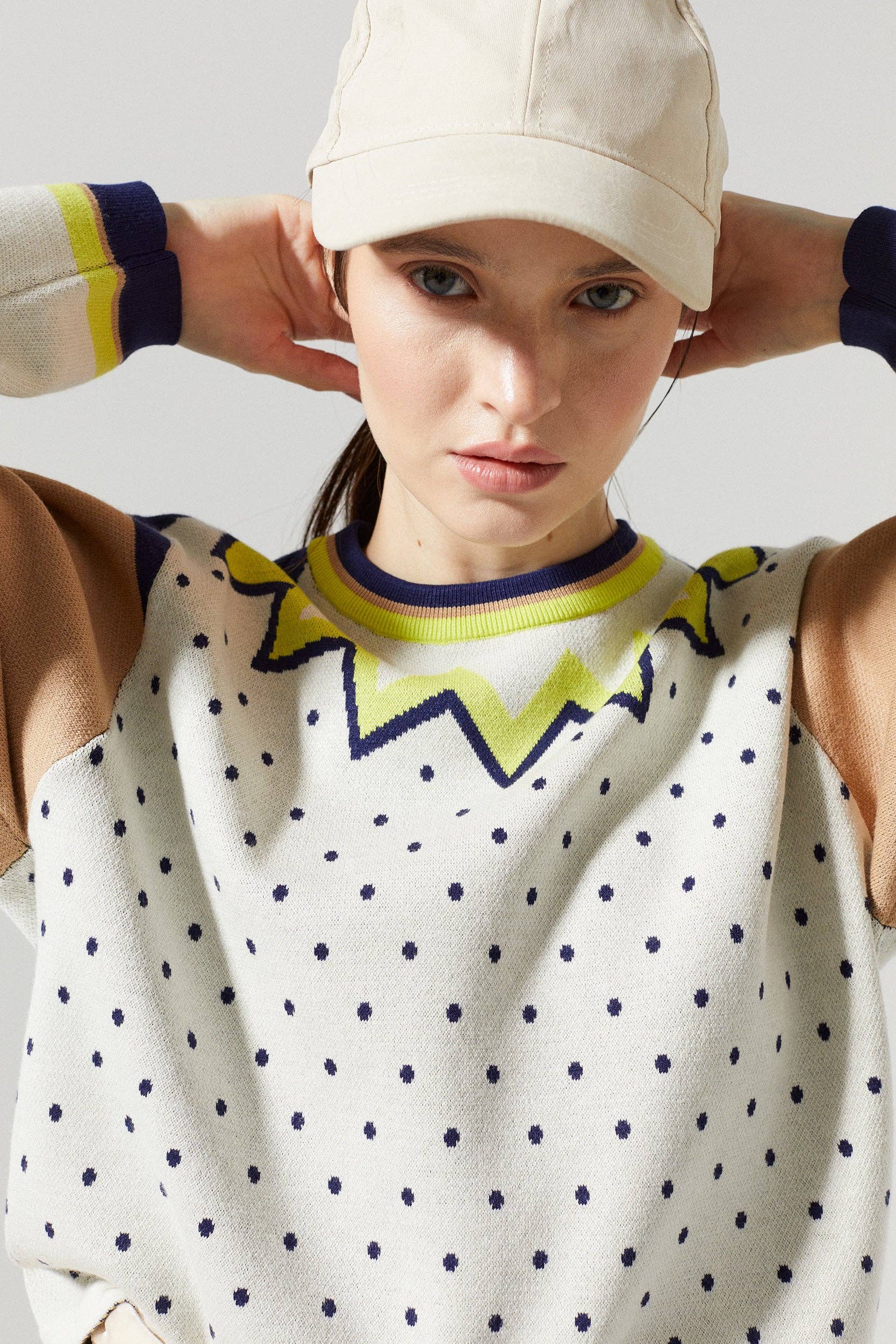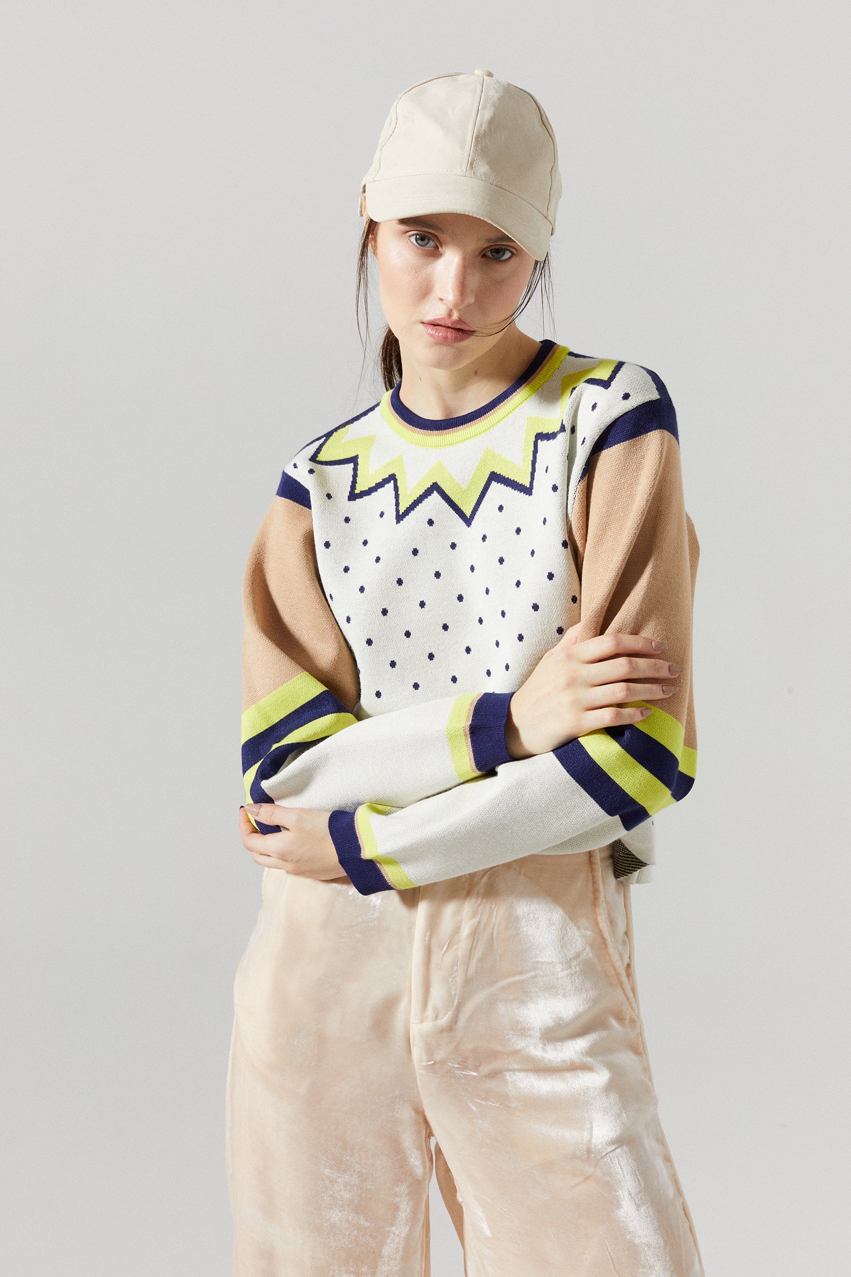We love our Cumelen Sweater, which takes us straight to Patagonia. This fun and elegant knitted piece has a crewneck, long sleeves and a boxy silhouette, and the colorful jacquard design brightens up any fall rainy day.