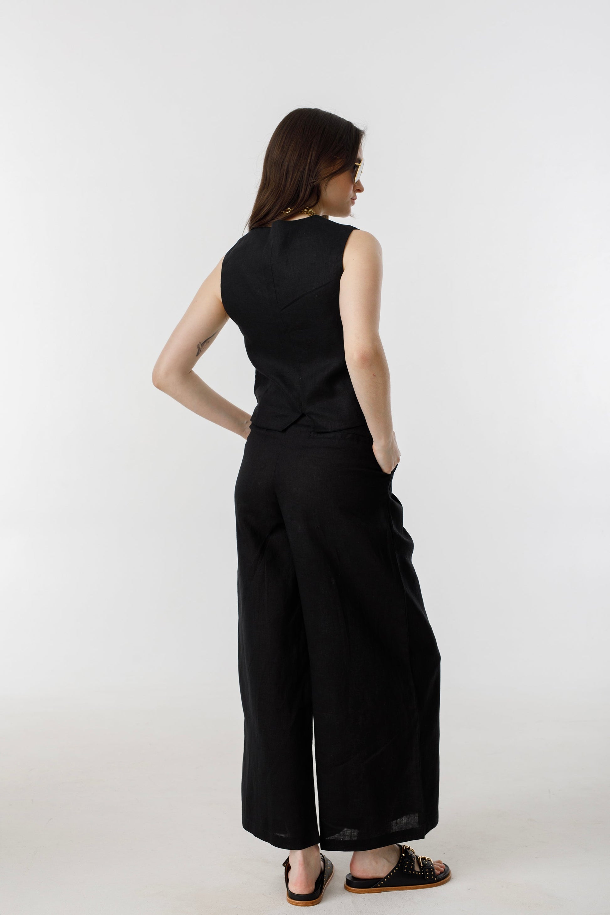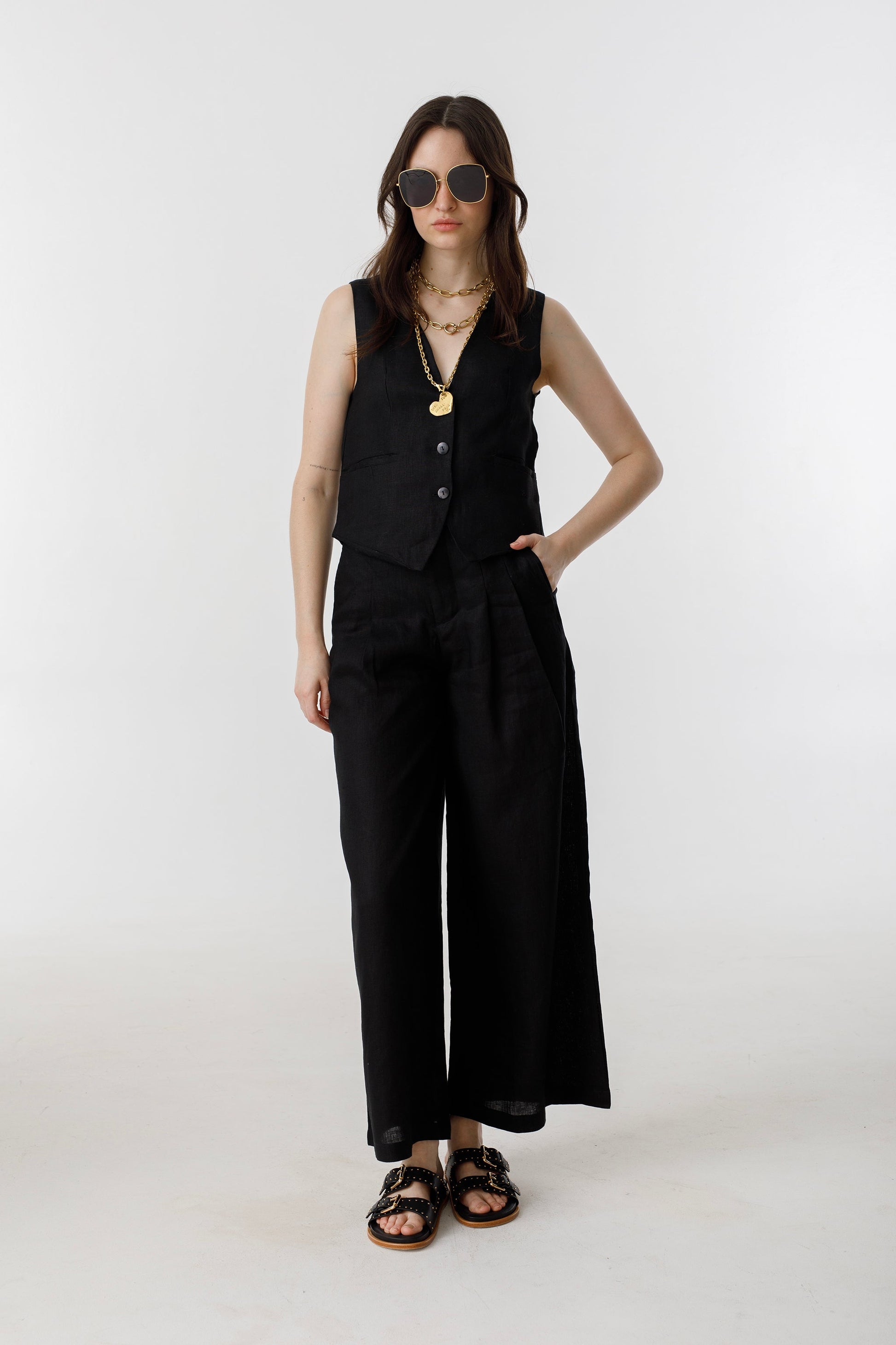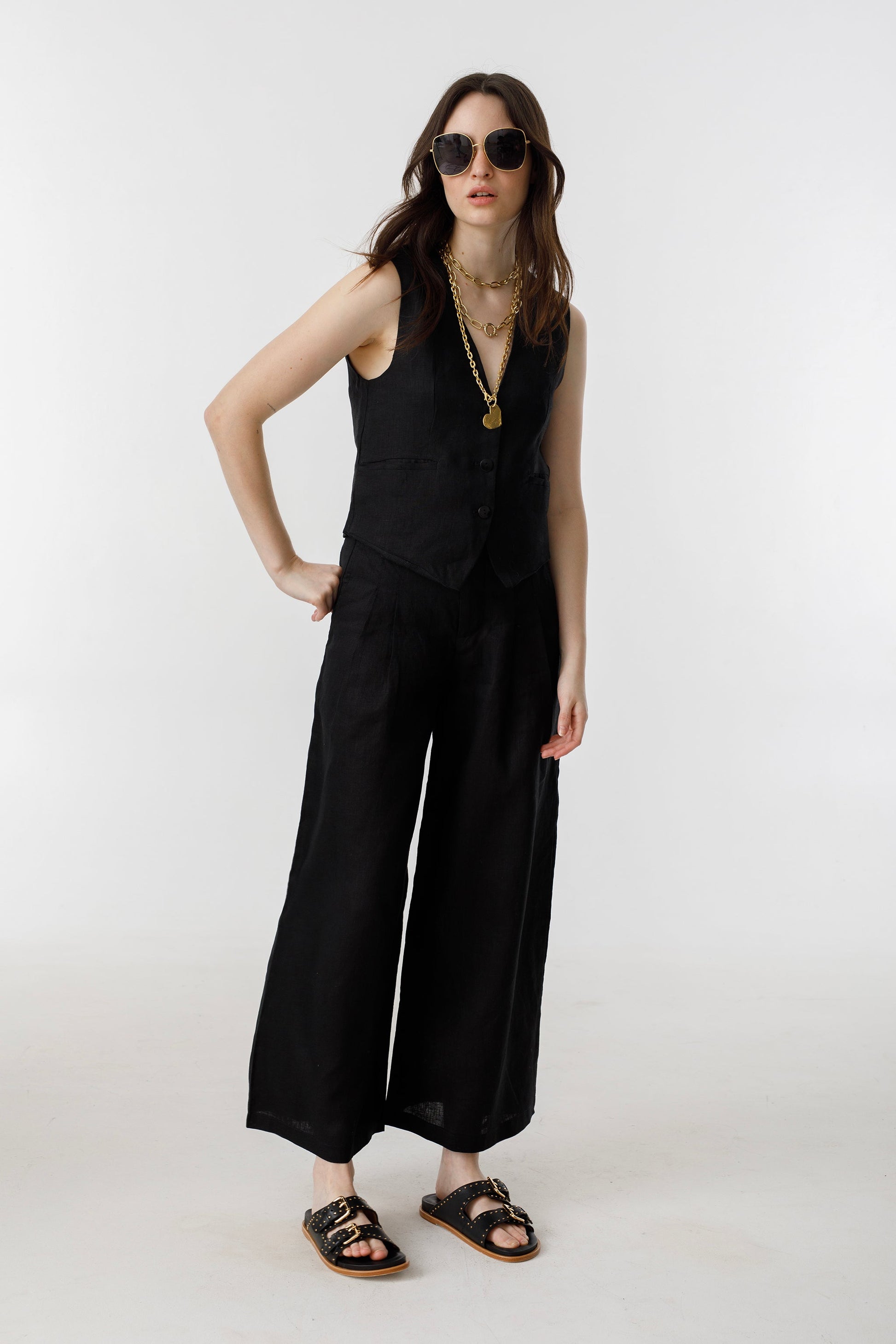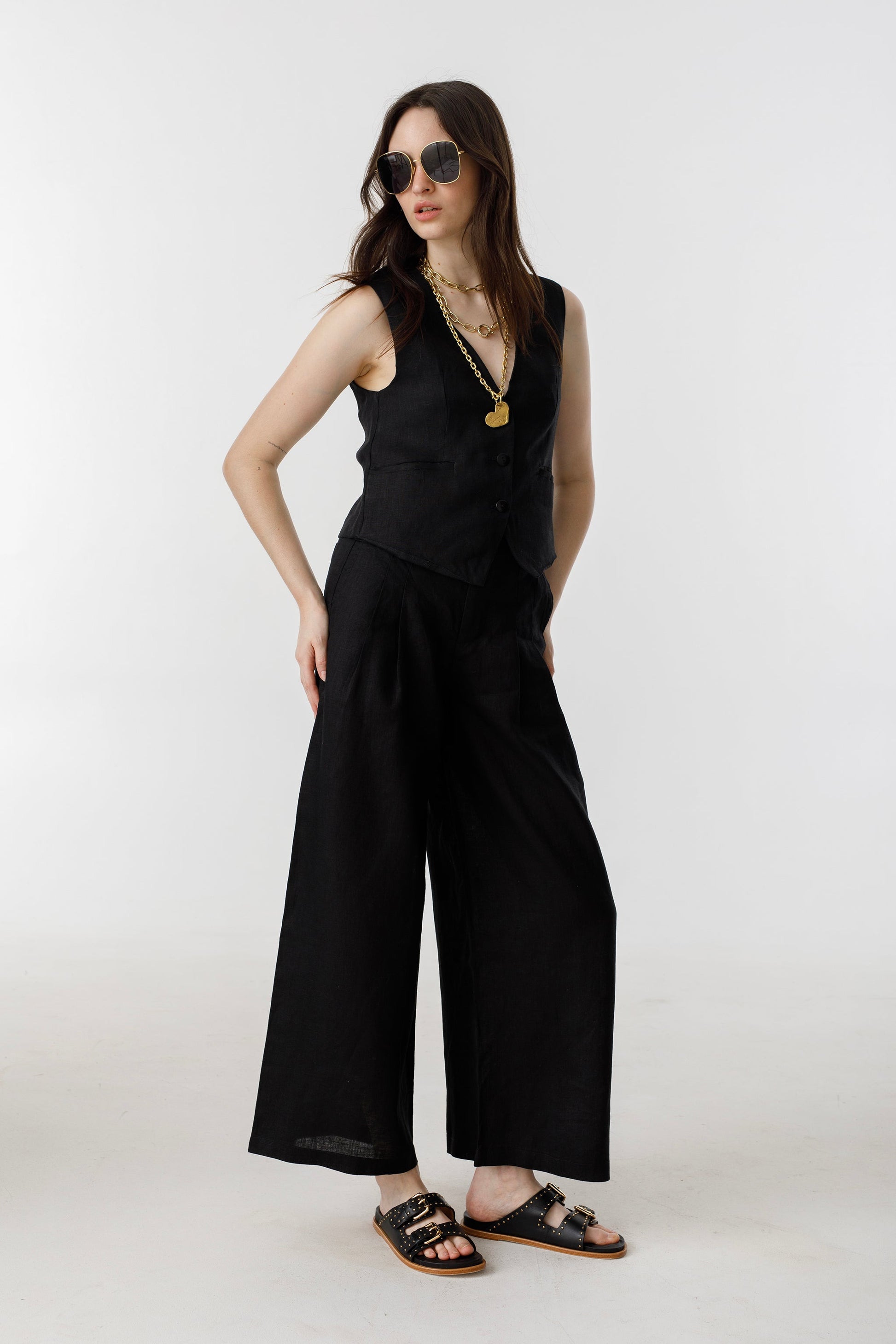Discover our bestselling high-waisted Culotte Linen Pants, designed with a structured waistband for added support and comfort. These wide pants are perfect for those who love a snug fit around the waist and have a defined waistline. They offer a flattering silhouette and are ideal for creating a chic, polished look. They are made with our signature premium 100% organic linen. They have side pockets and front zipper fastening with a hook.