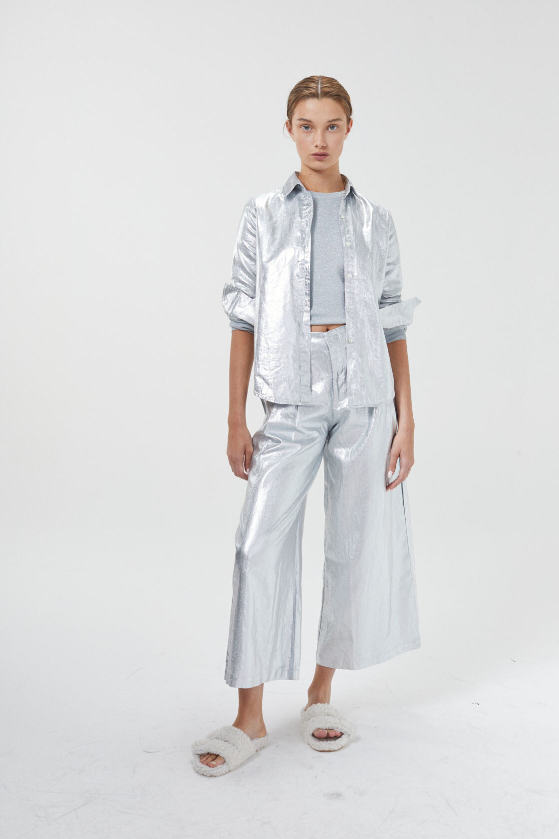 Discover our bestselling high-waisted Culotte Metallic Linen Pants, designed with a structured waistband for added support and comfort. These metallic wide pants are perfect for those who love a snug fit around the waist and have a defined waistline. They offer a flattering silhouette and are ideal for creating a chic, polished look. They are made with our signature premium 100% organic linen, finished with a metallic coating. They have side pockets and front zipper fastening with a hook.