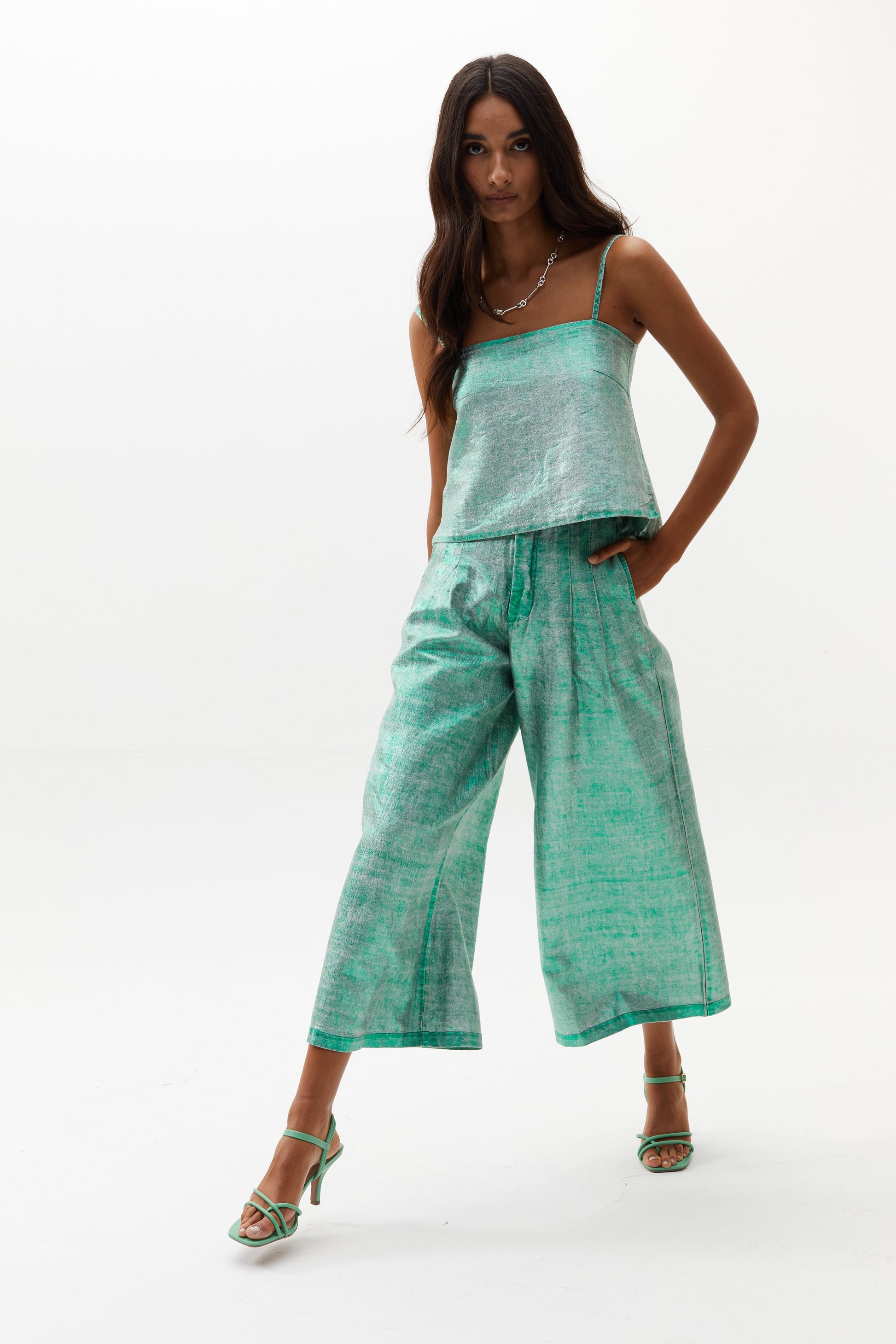 With the look of a skirt and the comfort of trousers, this gently pleated wide linen pant is made for you. The Culotte Pants are designed for maximum comfort and an elegant look, and the metallic foil print adds a chic, modern vibe that will make it your favorite statement piece.