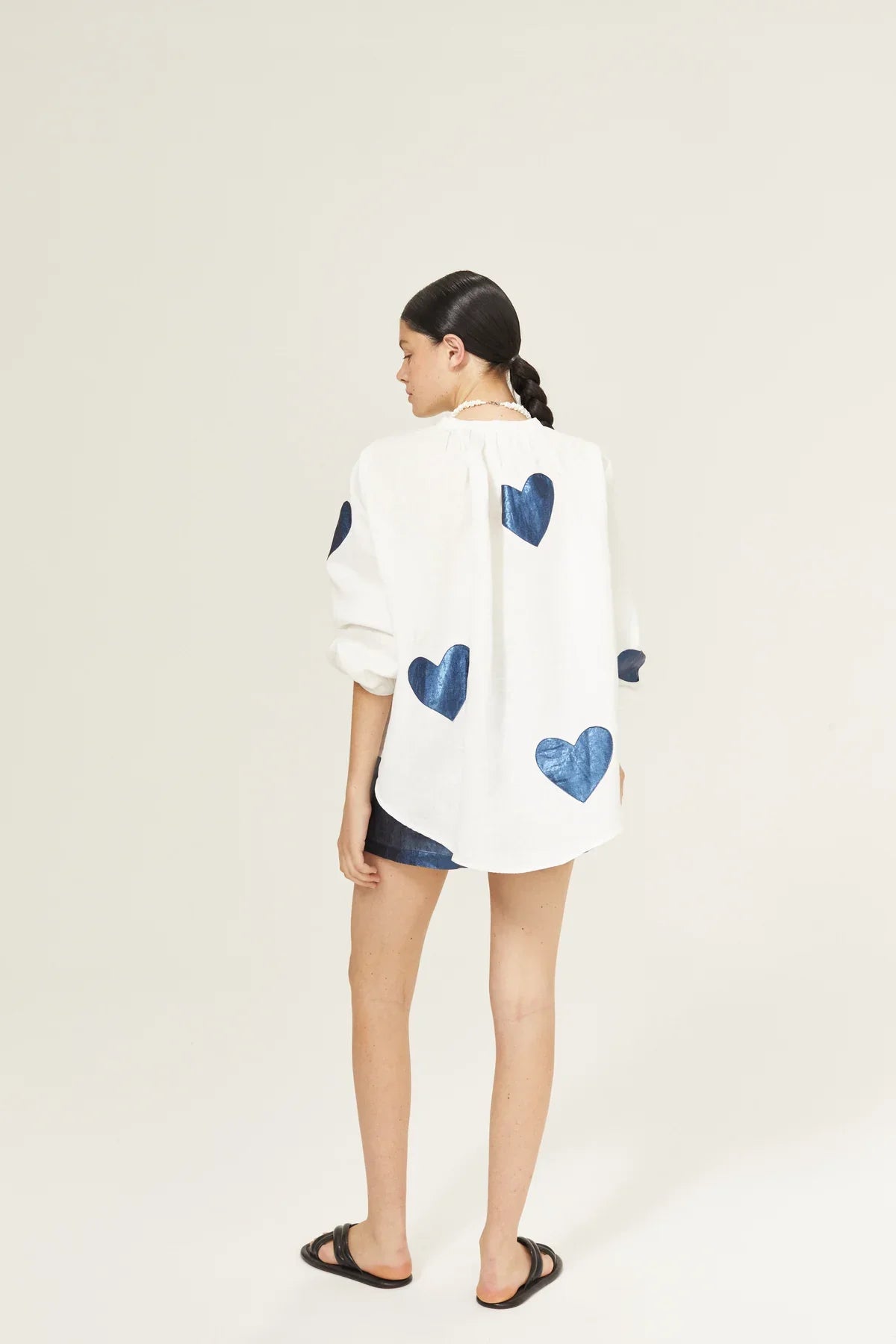 Cupid Linen Shirt - Off-white with Metallic Dark Blue Hearts