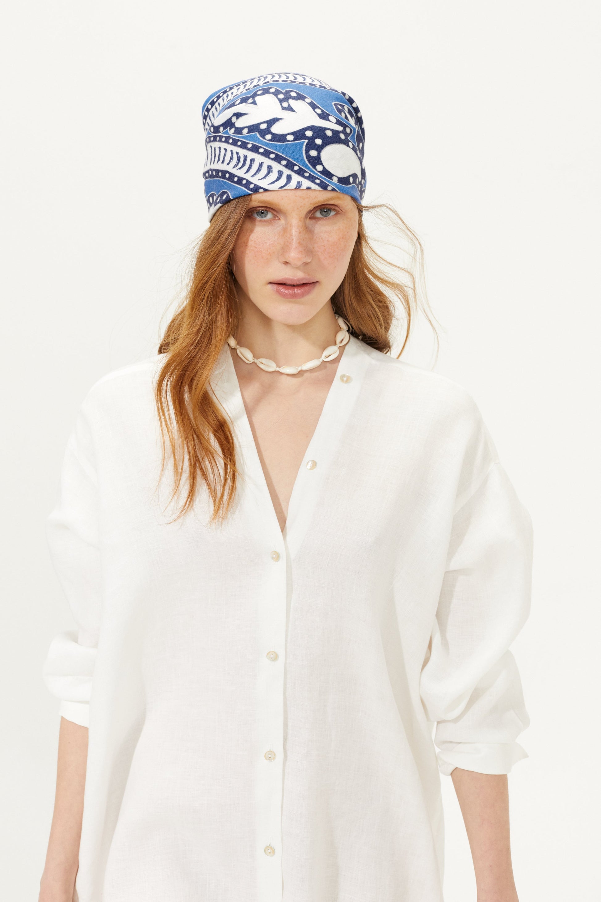 Our model is wearing it with the Linen Bandana in our Mykonos print.