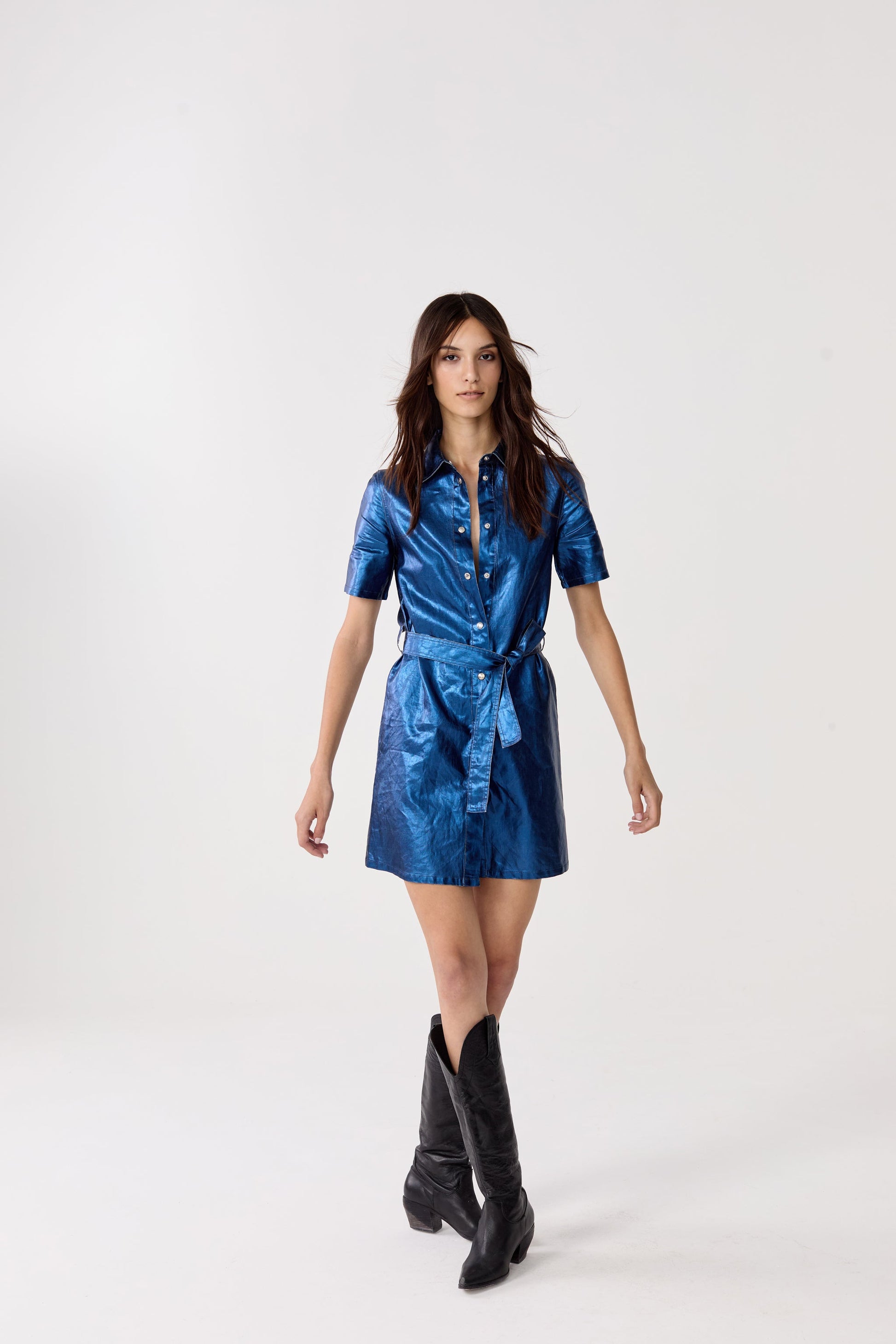 Our new Franca Metallic Linen Dress is a feminine and easy button-down short dress.