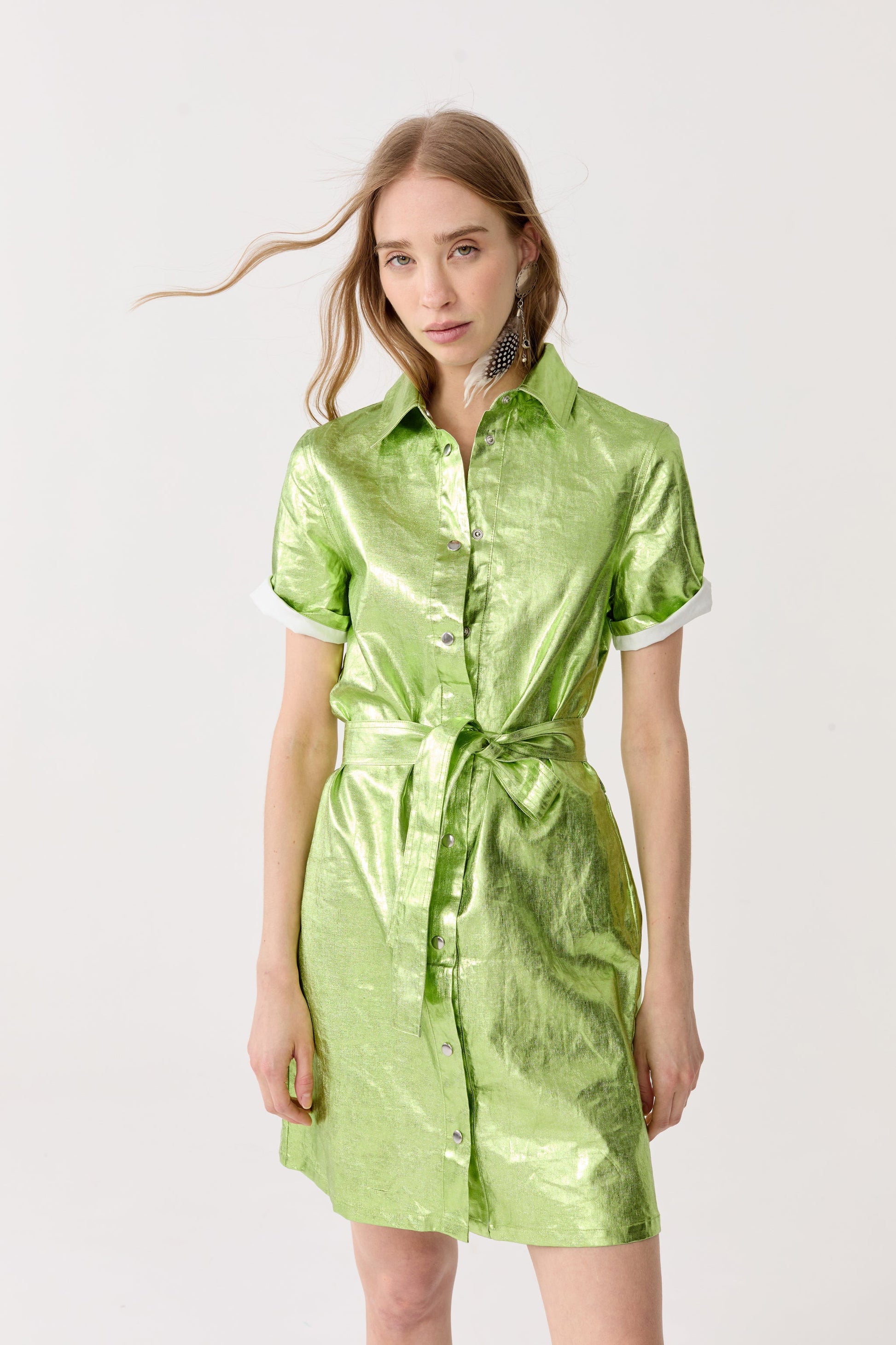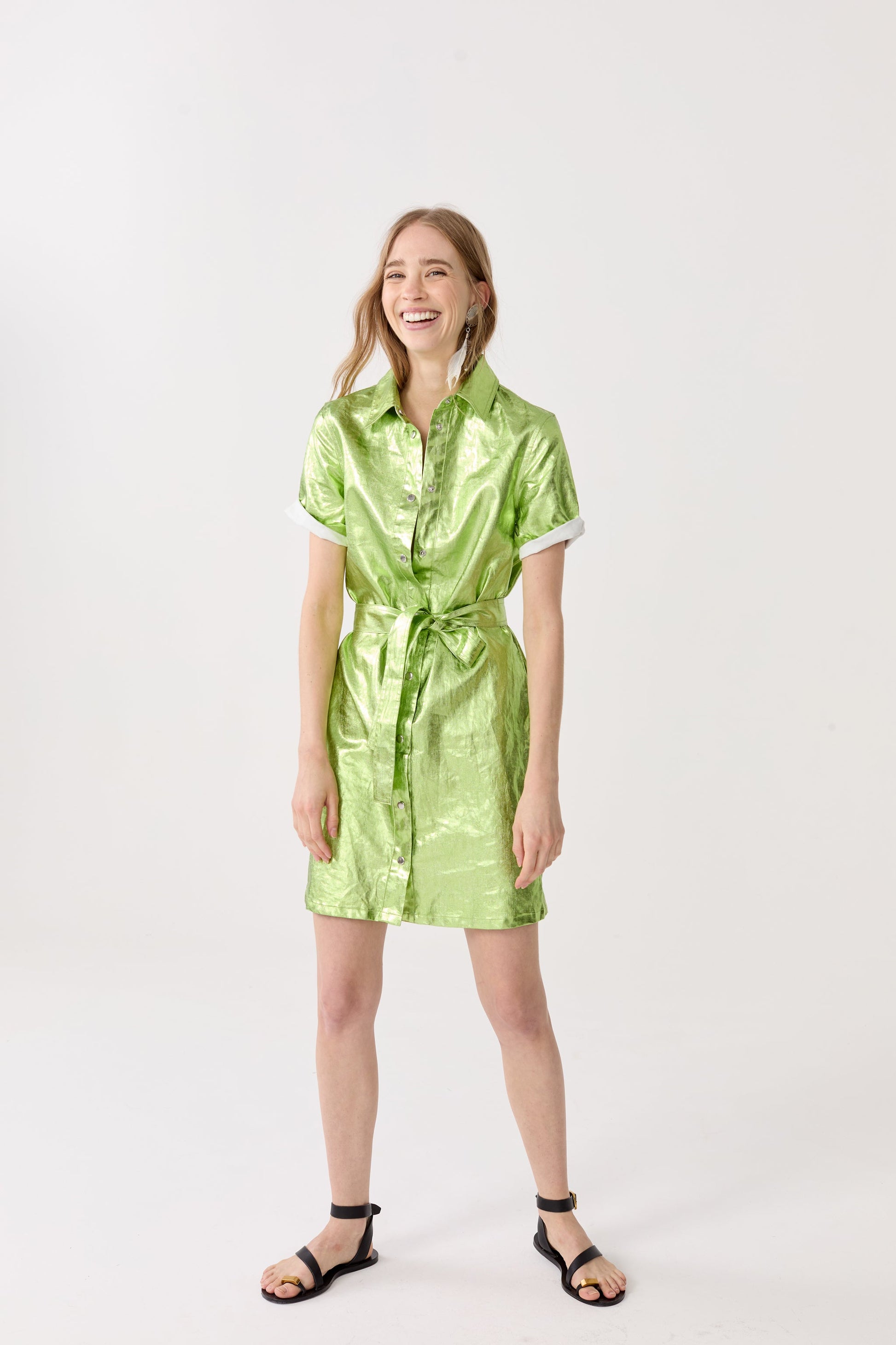 Our new Franca Metallic Linen Dress is a feminine and easy button-down short dress.