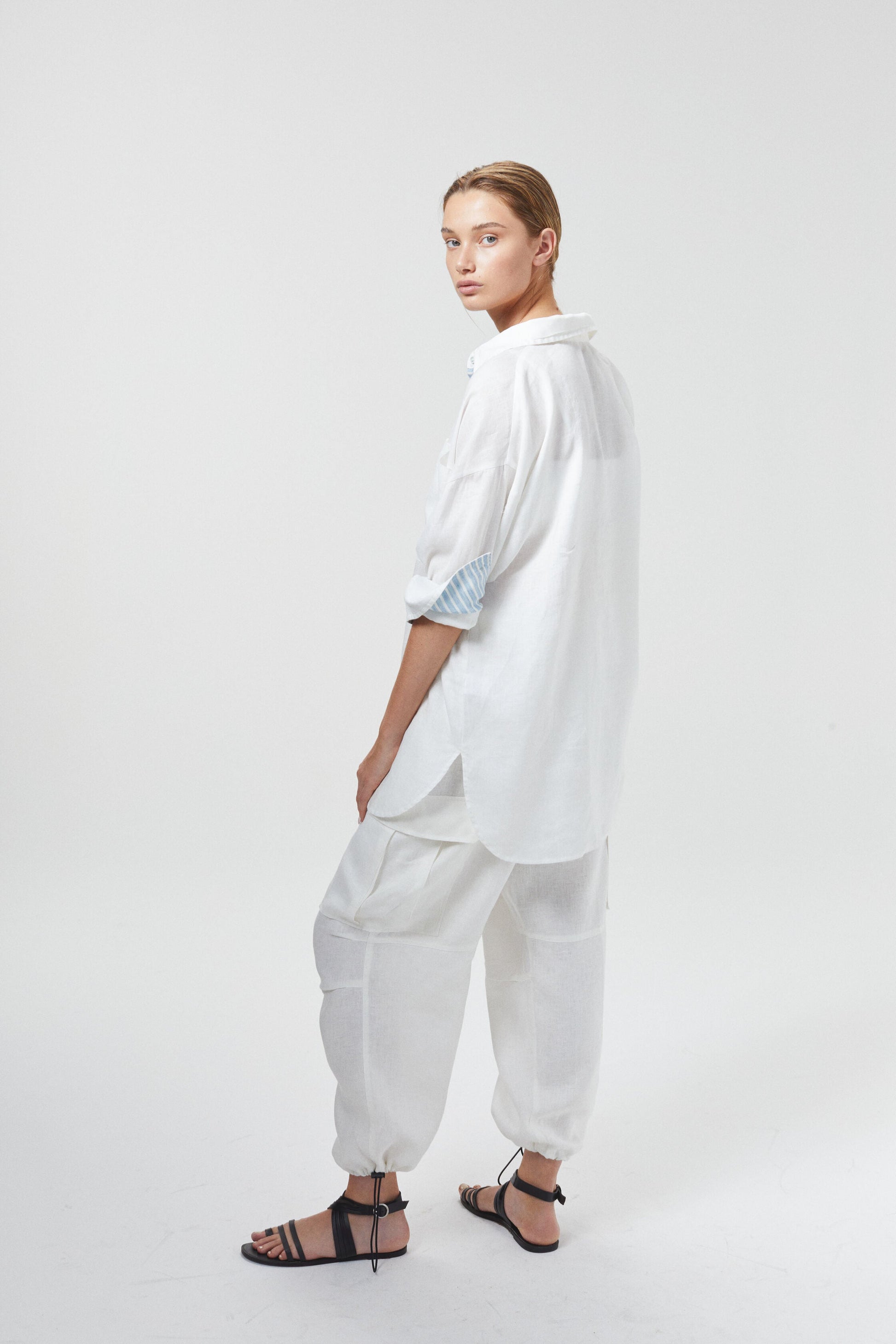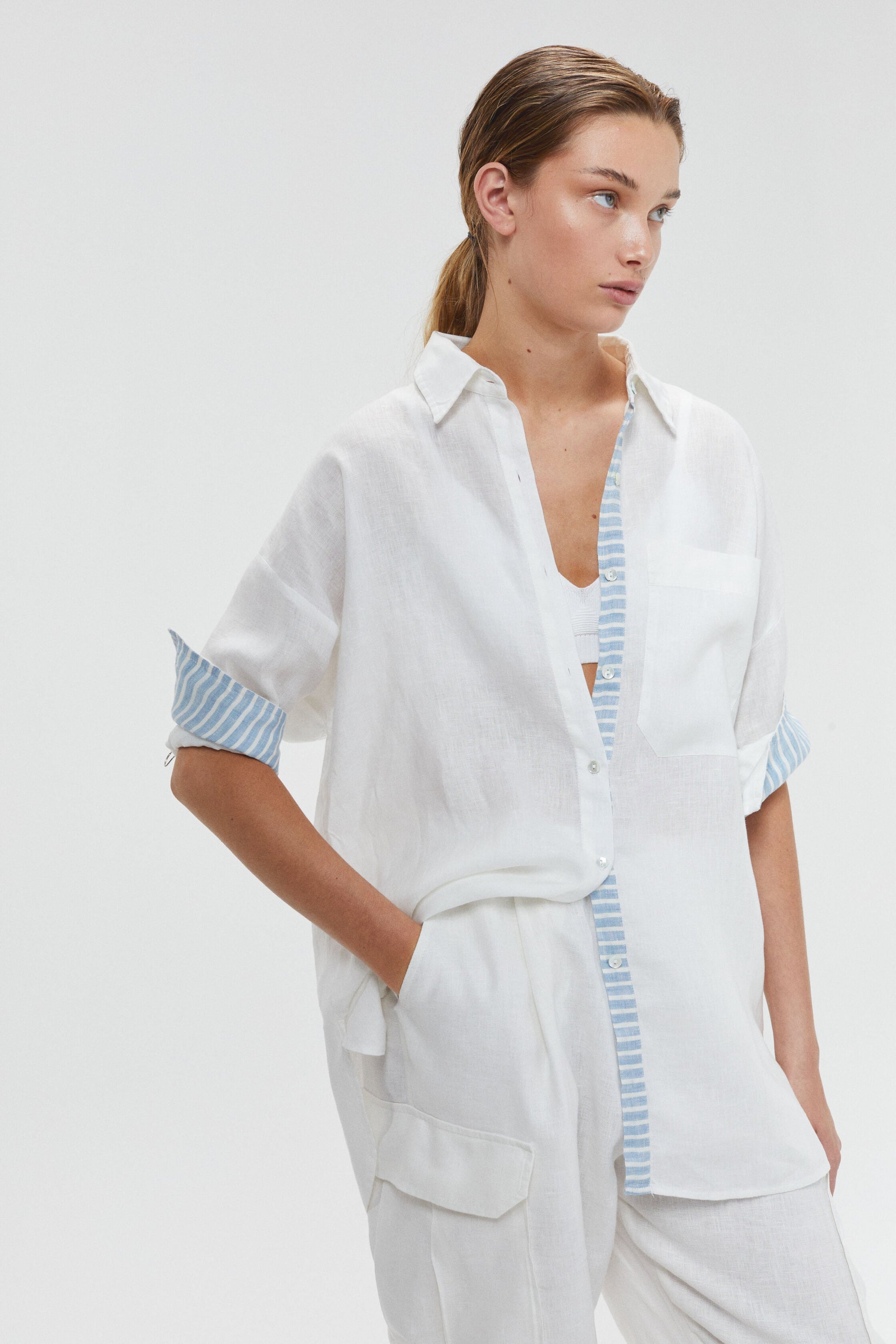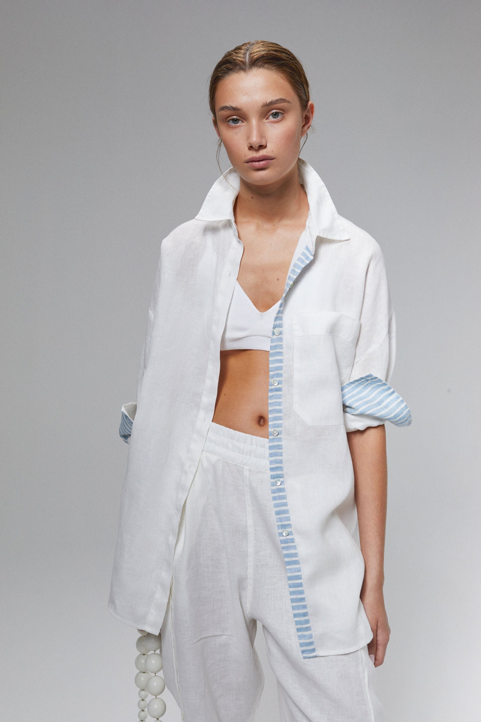The Island Linen Shirt is the perfect oversized piece for any wardrobe. Easy and chic, it features shell buttons, a classic collar and a longer hemline on the back. It’s made with our premium 100% organic linen, with contrasting printed details in the buttons placket and cuffs.
