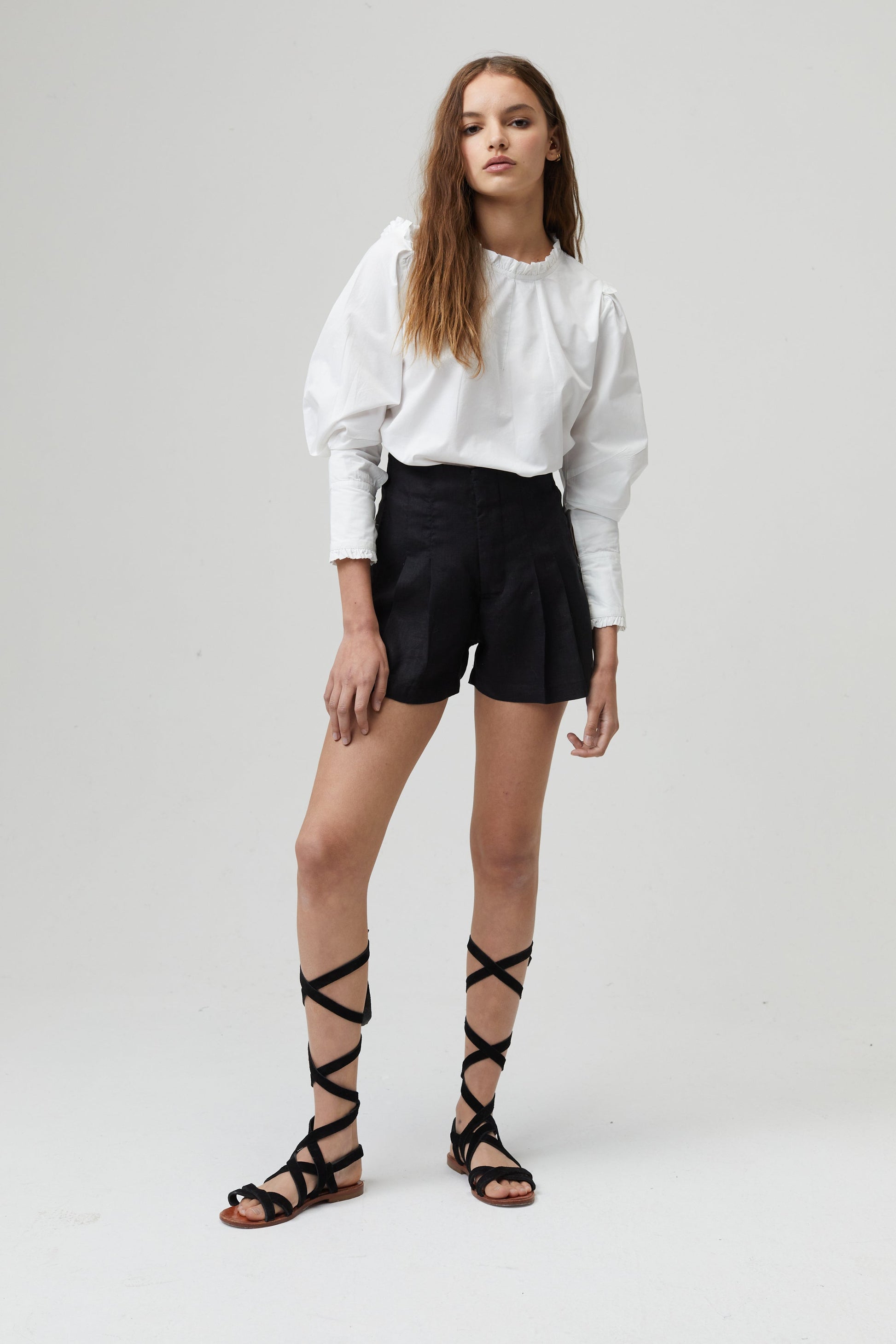 Our model is wearing it with the Frida Linen Shorts and the Power Knitted Top.