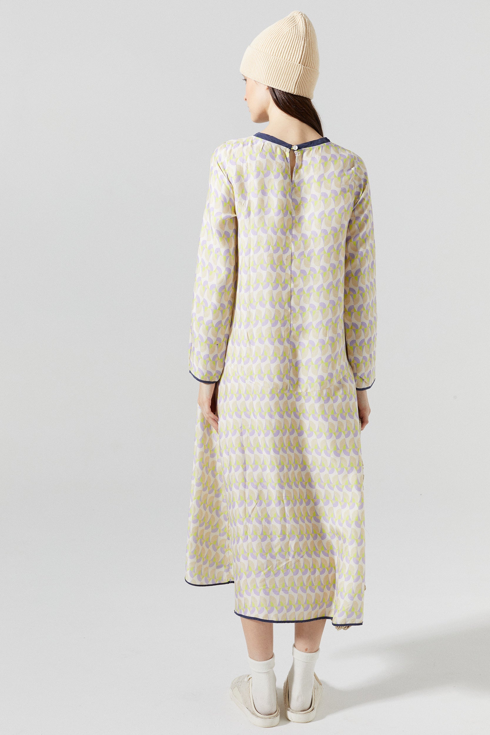 This midi dress features Navy Blue piping in the neckline, hem and cuffs, adding a bit of contrast that goes super well with our retro Kelso print.