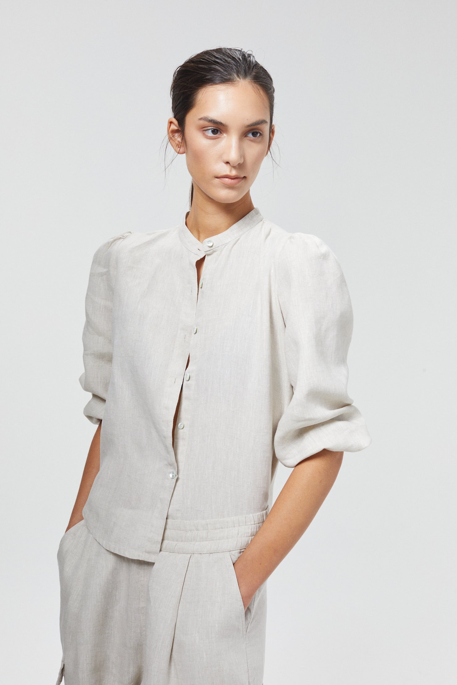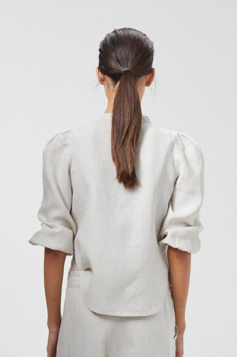 It's made with the softest 100% linen, pre-washed and softened for a super easy handling and lovely drape. It features a mandarin neck, shell buttons and long balloon sleeves with elastic cuffs.