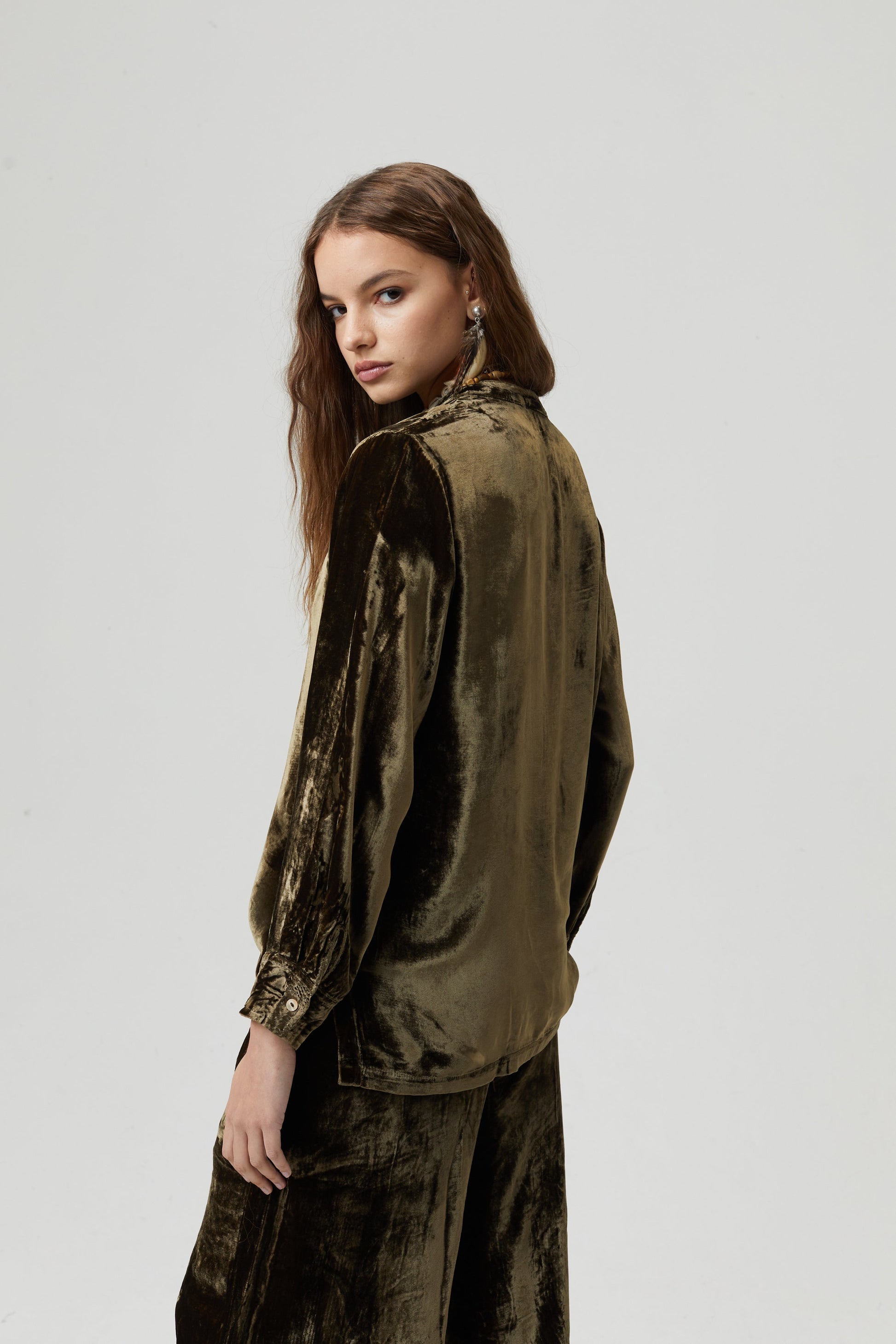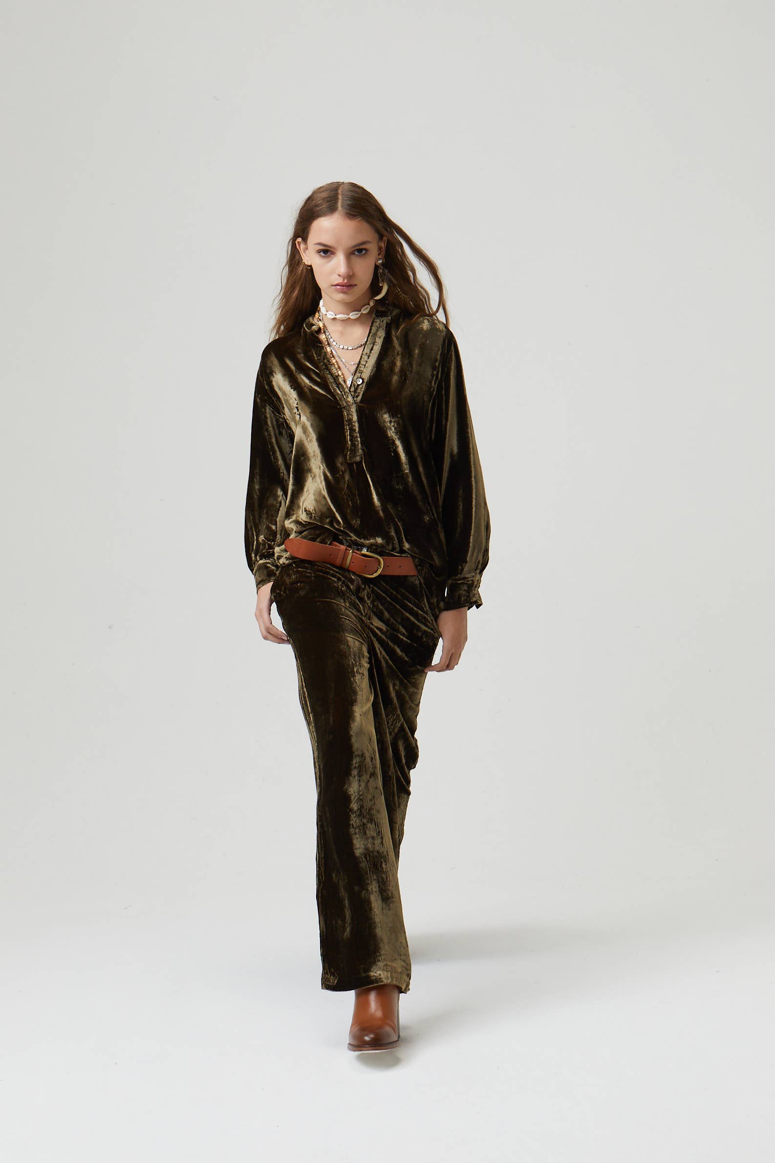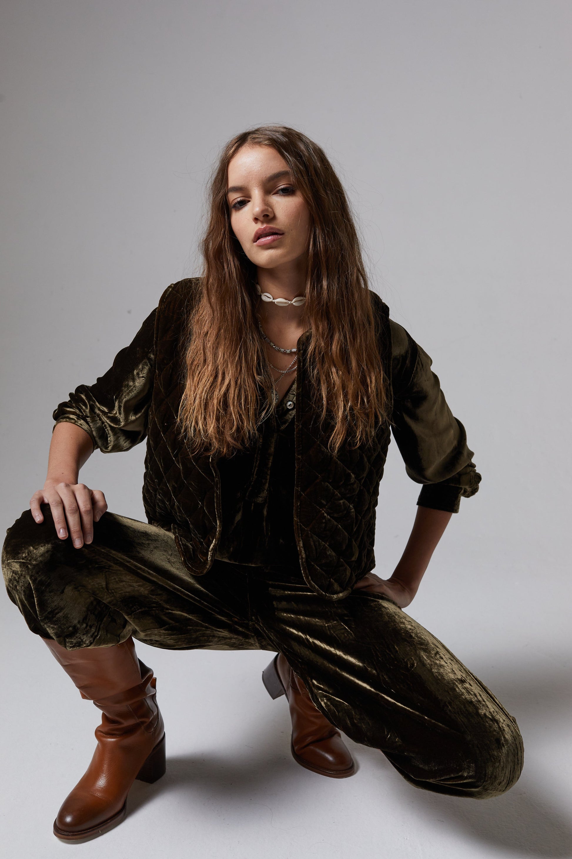 When comfy meets sophistication. The New Luna Pant features wide legs and a flattering high-waist with elastic back waistline for a better fit. The pure silk velvet elevates this style while adding a rich texture and lovely drape, making it the perfect statement piece for a special occasion.