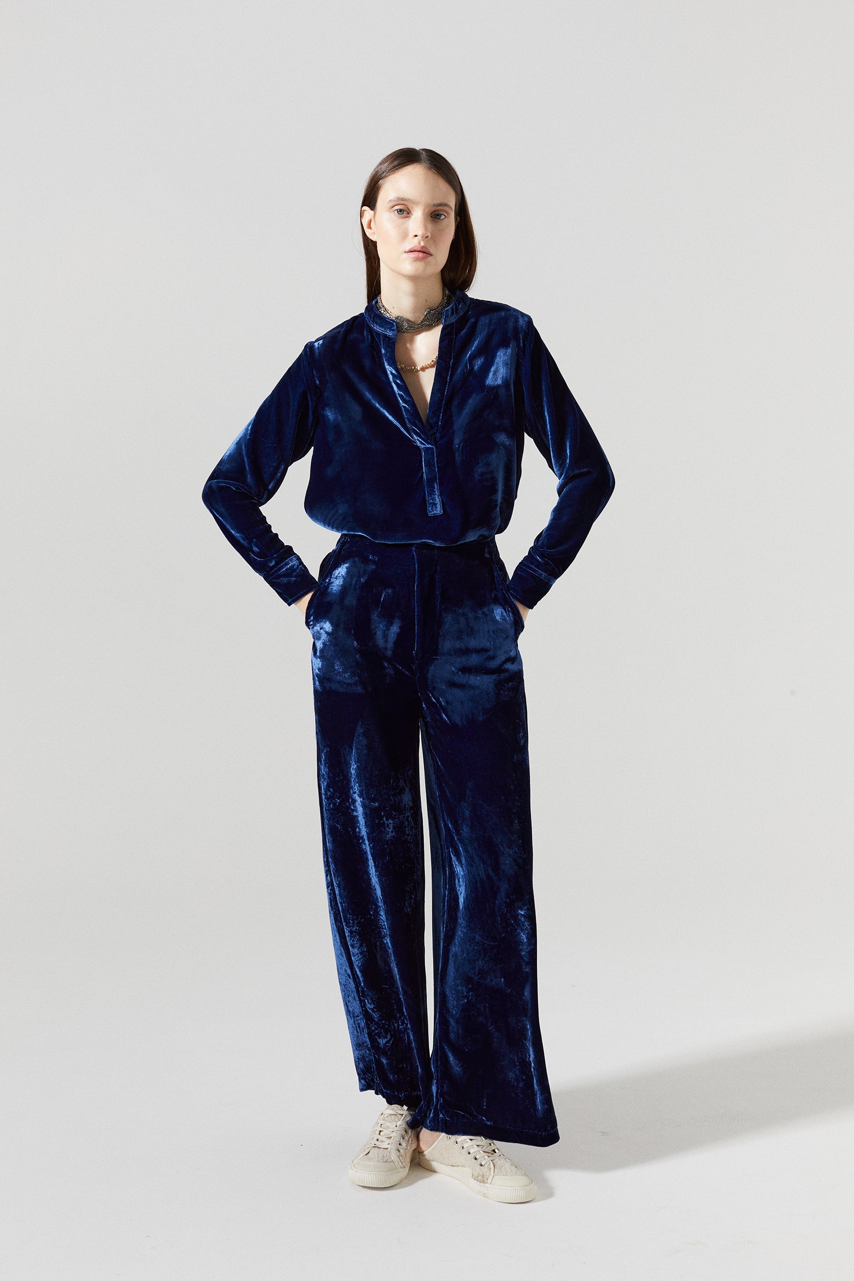 The Nikka Shirt is the elevated classic you’ll adore for this season. Effortless and elegant, it’s made with pure silk velvet, which adds a lovely shine and texture to this style. It features long sleeves and a Mao V-neck.