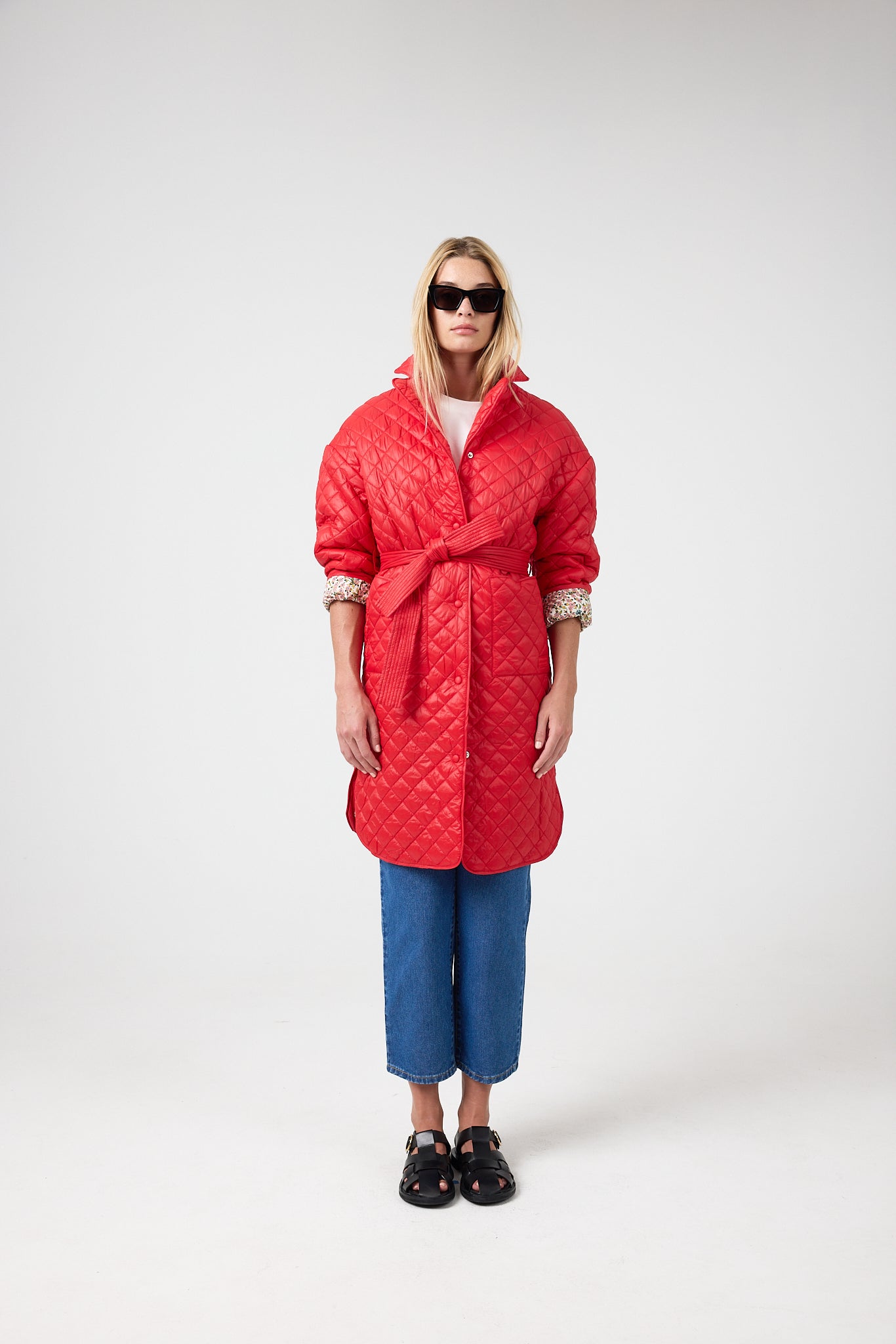 The Nikoa Nylon Quilted Coat is an essential addition to your wardrobe. Chic and effortless, it boasts a midi length and curved hem, and the waist belt adds to its flattering silhouette. It features a cloverleaf lapel, convenient front pockets, and covered snap buttons. Elevate your outfit with this versatile nylon quilted coat.