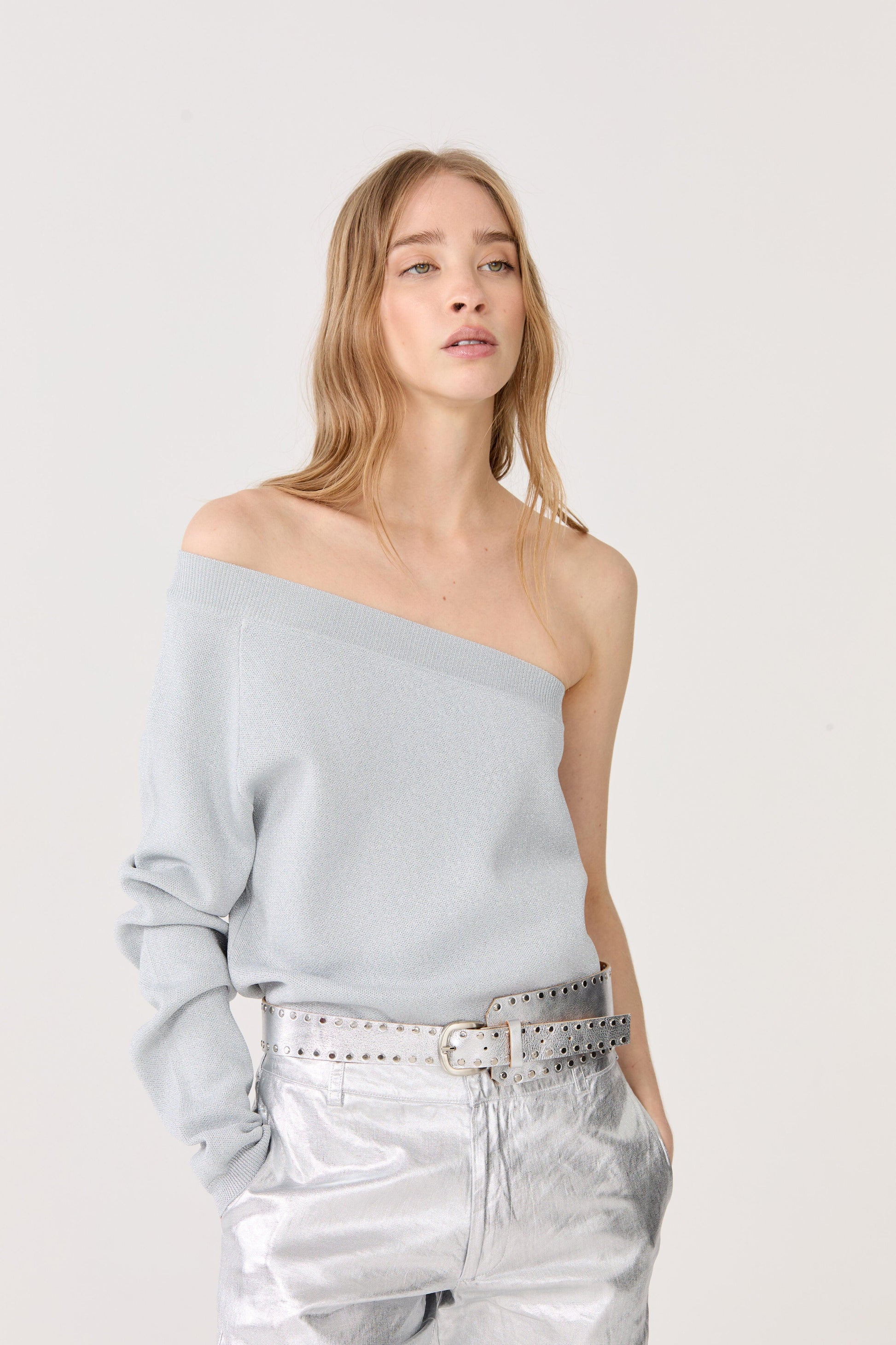 The one-shoulder lurex knitted top is the perfect investment piece - it's timeless, elegant and glamorous. This top is knitted with lurex for a shiny texture, and its relaxed silhouette makes it perfect for pairing with any of our pants.