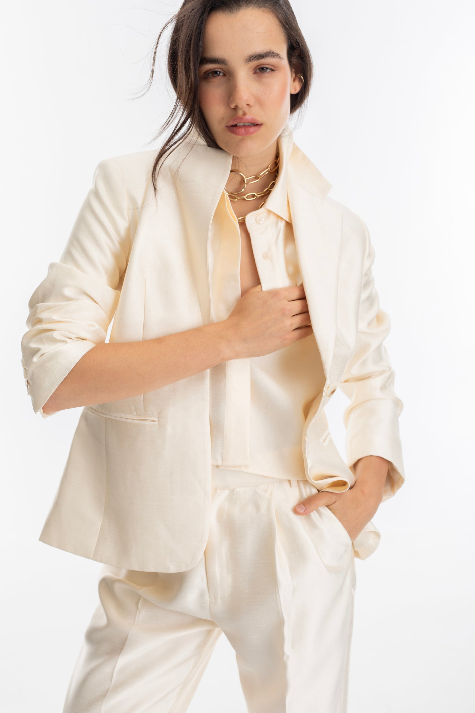 Our Oslo Blazer is one of our top picks for the holiday season. It features a pointed lapel and single button closure with welt pockets. It’s crafted from taffeta fabric, which has a soft shine in a cream hue.