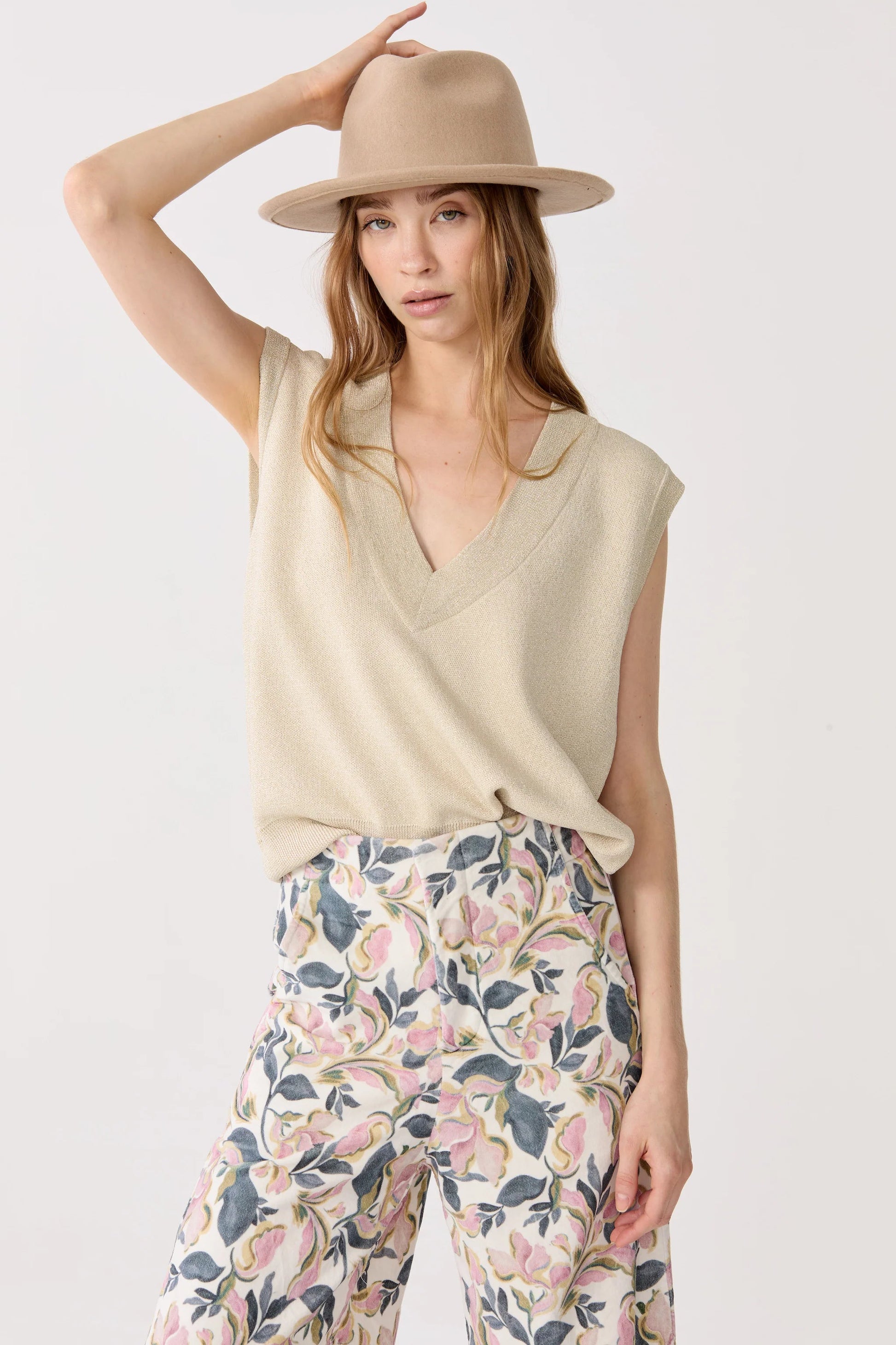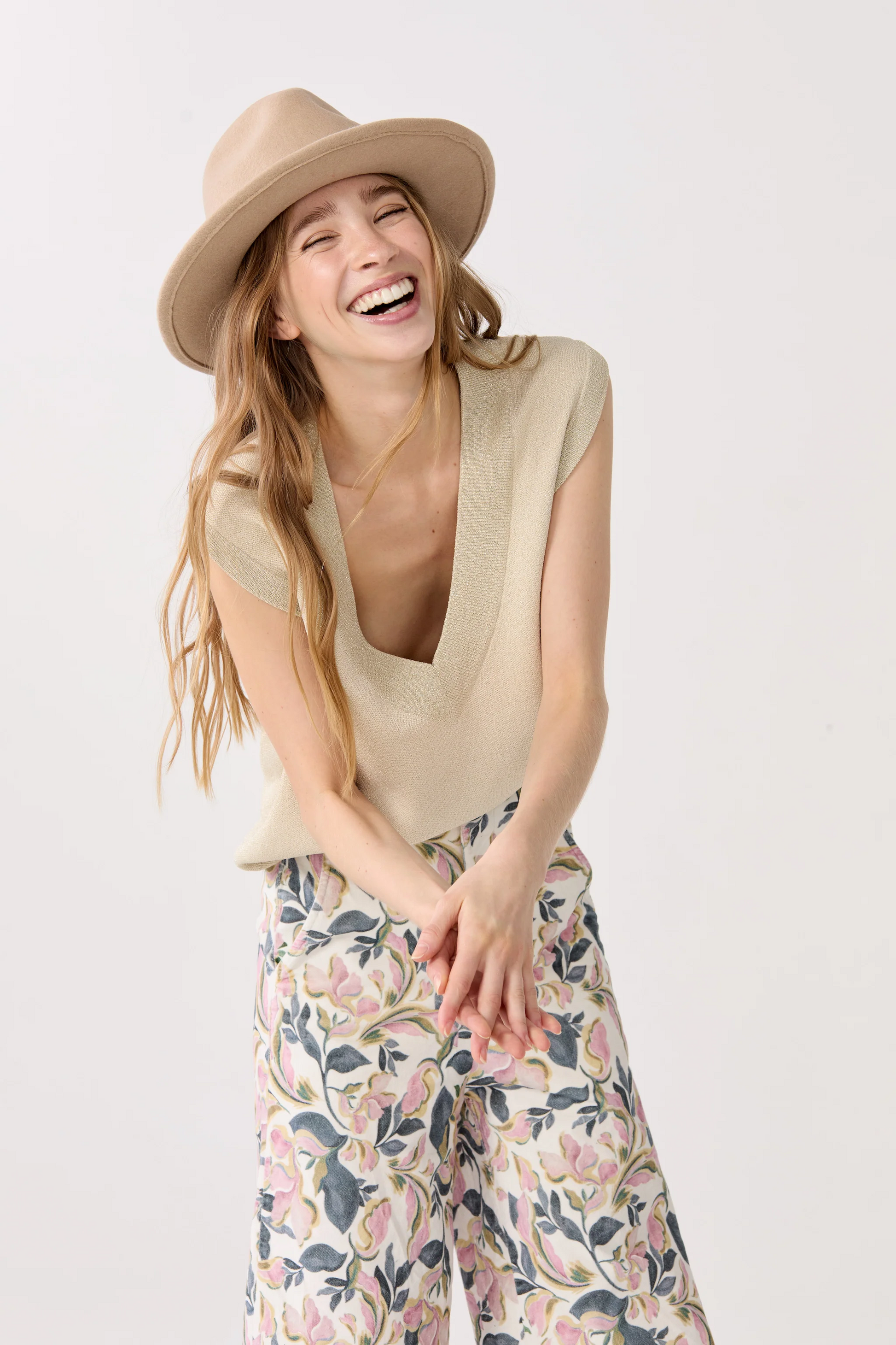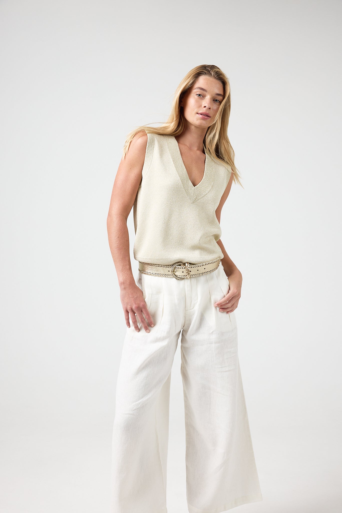 Meet your new favorite wardrobe essential – our preppy knitted vest with a dash of shimmering lurex magic! This comfy and stylish V-neck vest is all about easygoing vibes and laid-back charm. Throw it on over our Samba shirt or pair it with your go-to jeans for an effortlessly cool look. With its playful lurex thread, this vest adds just the right amount of sparkle to your everyday style.