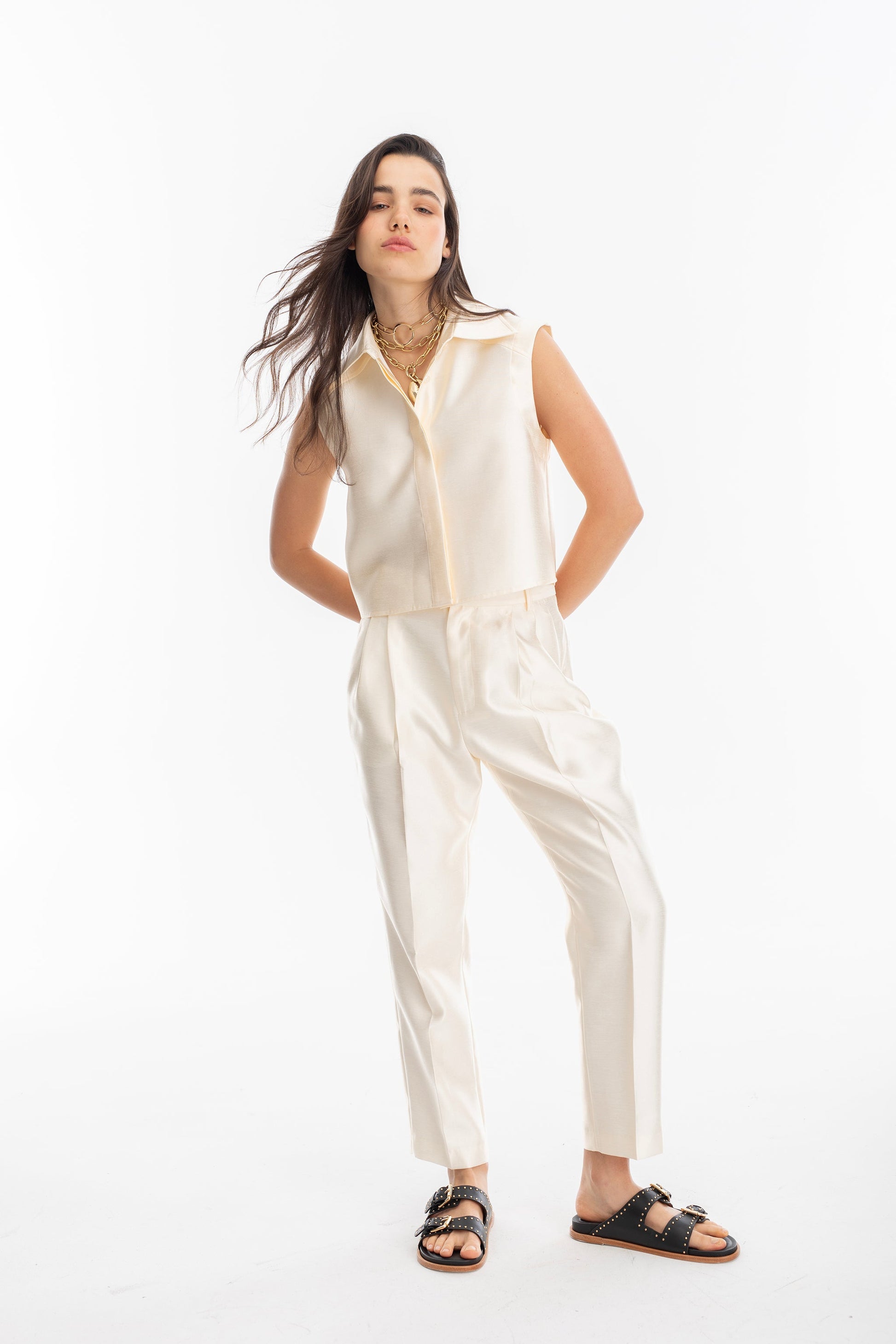 These high-waisted carrot pants feature pleats in the front and one welt pocket on the back. They are made with taffeta fabric, which has a soft shine in a cream hue, making them perfect for the holiday season.