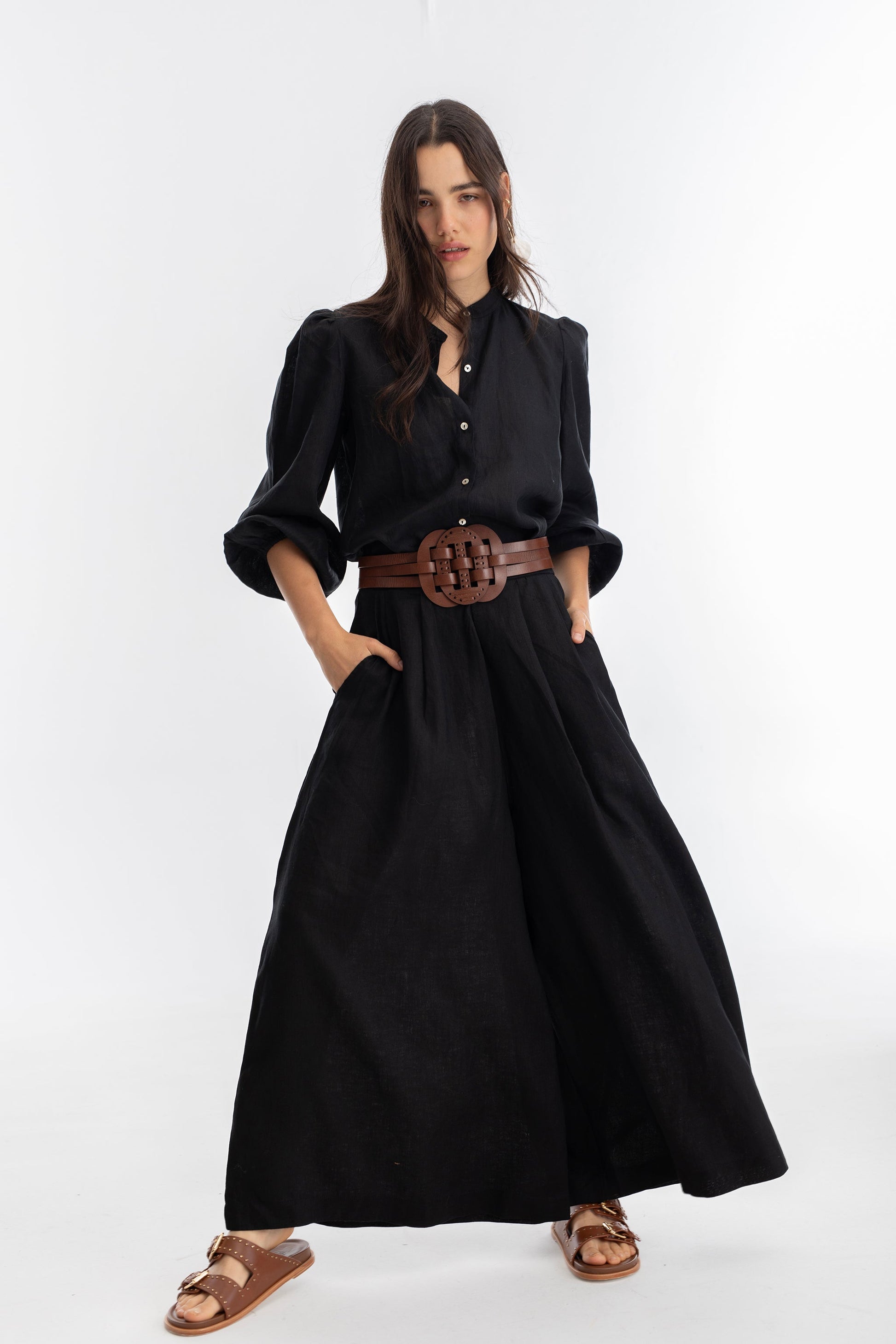 These super wide linen pants are flattering and easy. They feature a high waist with front pleats and an elastic band on the back for great comfort. The Sabi Pants are crafted from 100% natural linen, which is finished with a metallic coating.
