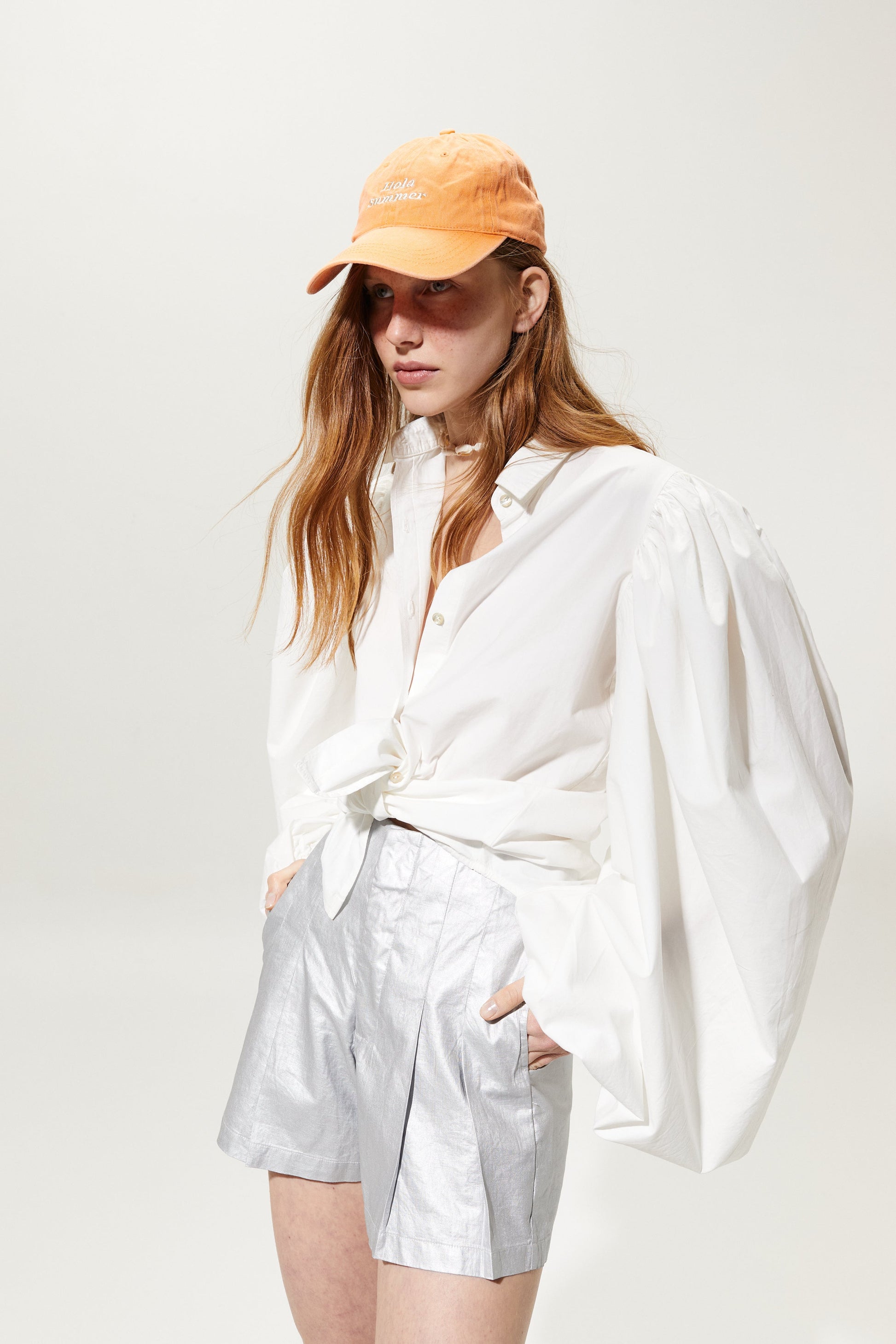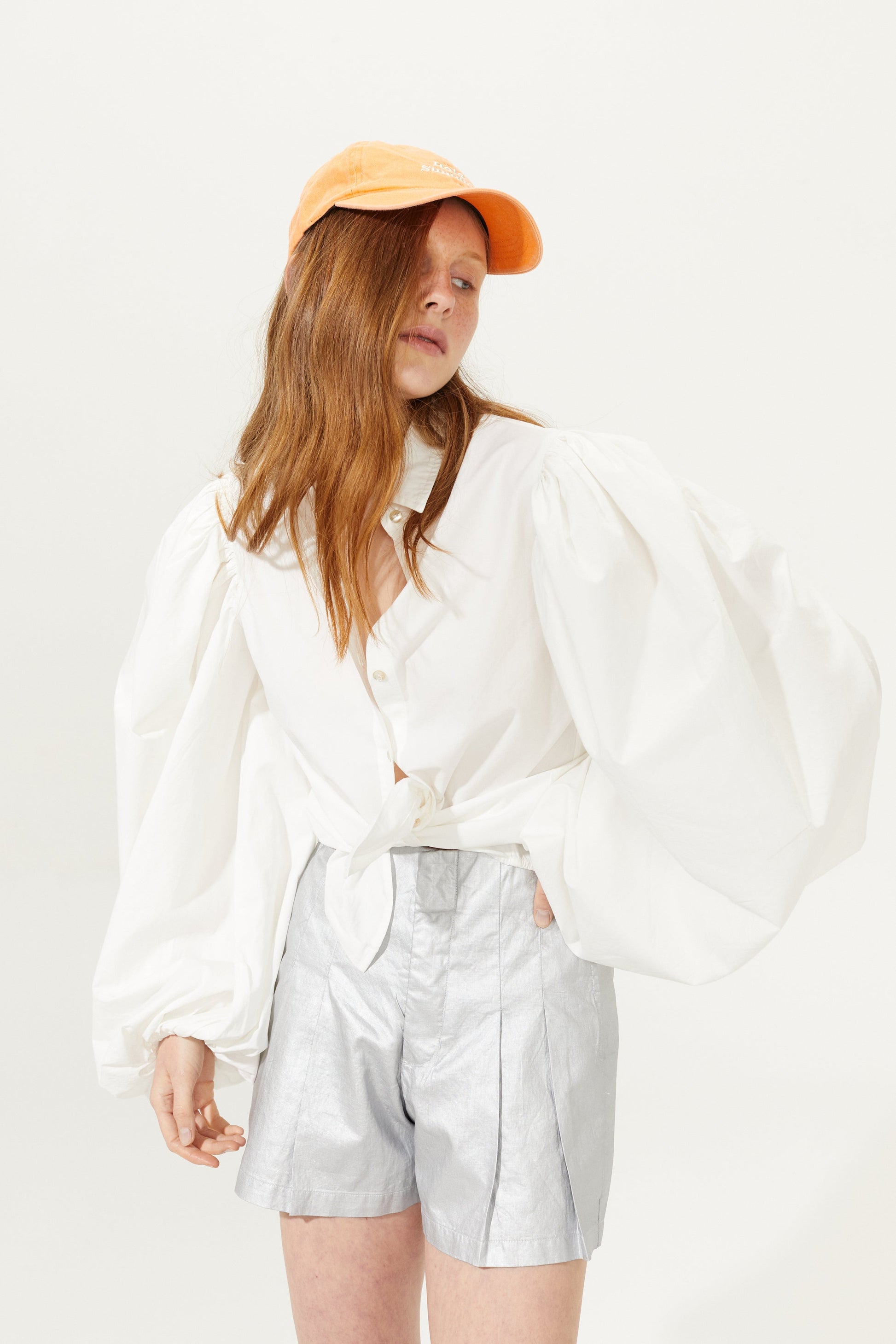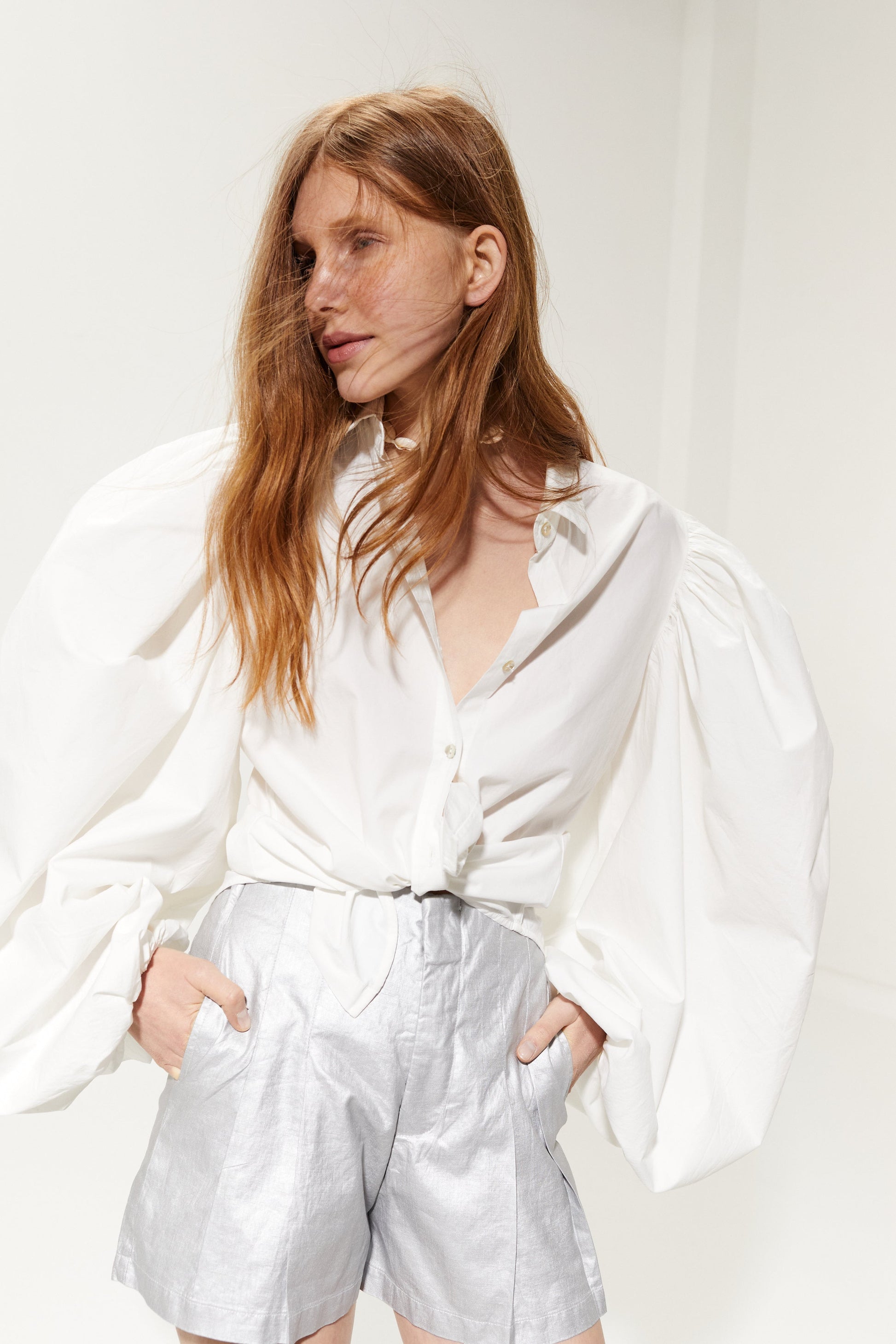 The Samba Cotton Poplin Shirt features super voluminous long sleeves, a classic collar and shell buttons, which makes it stand halfway between fun and elegant.