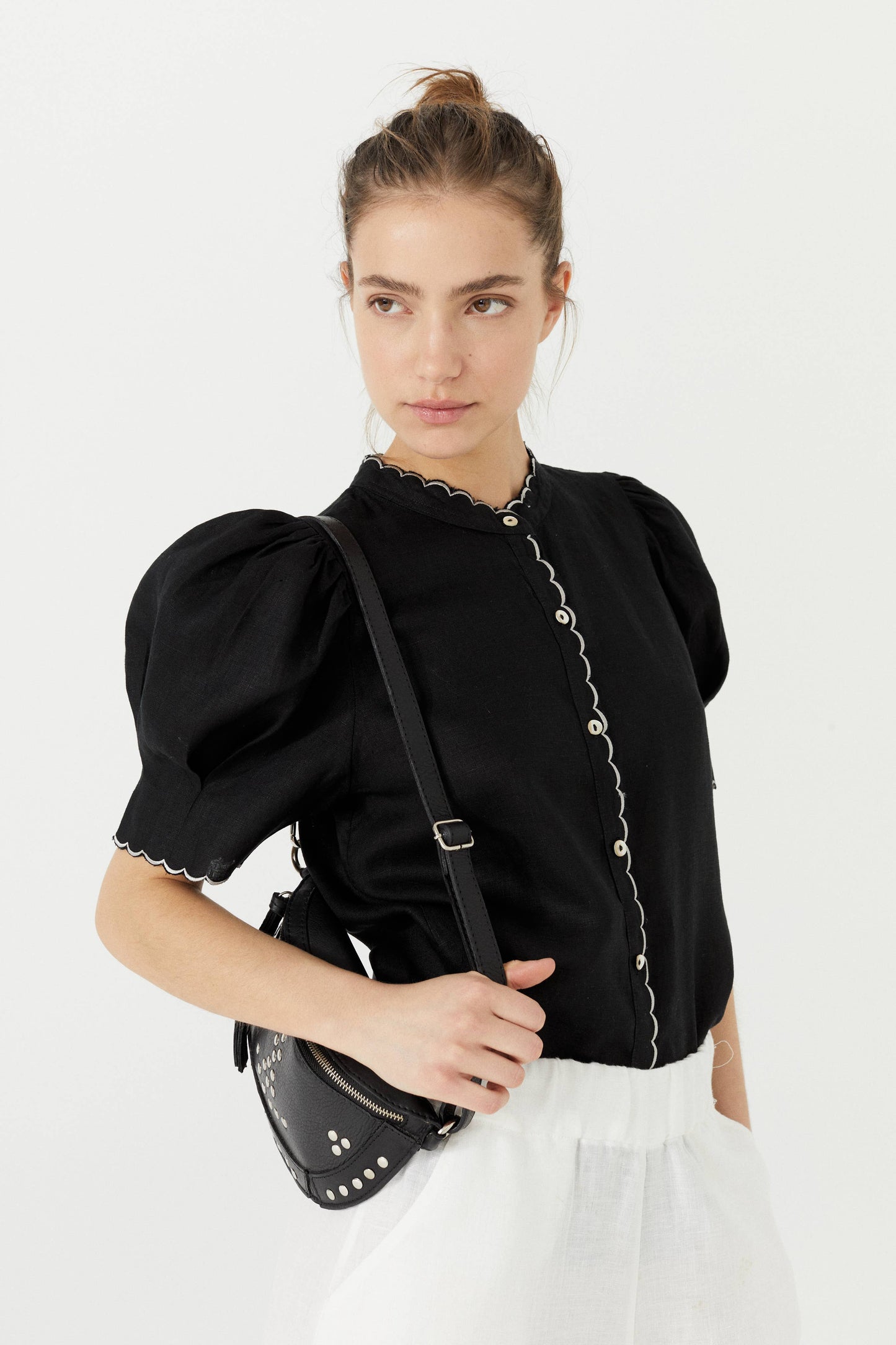 Flattering and flirty, this 100% natural linen shirt with embroidered details features puffed short sleeves, a minimalist mao neck and shell buttons on the front.