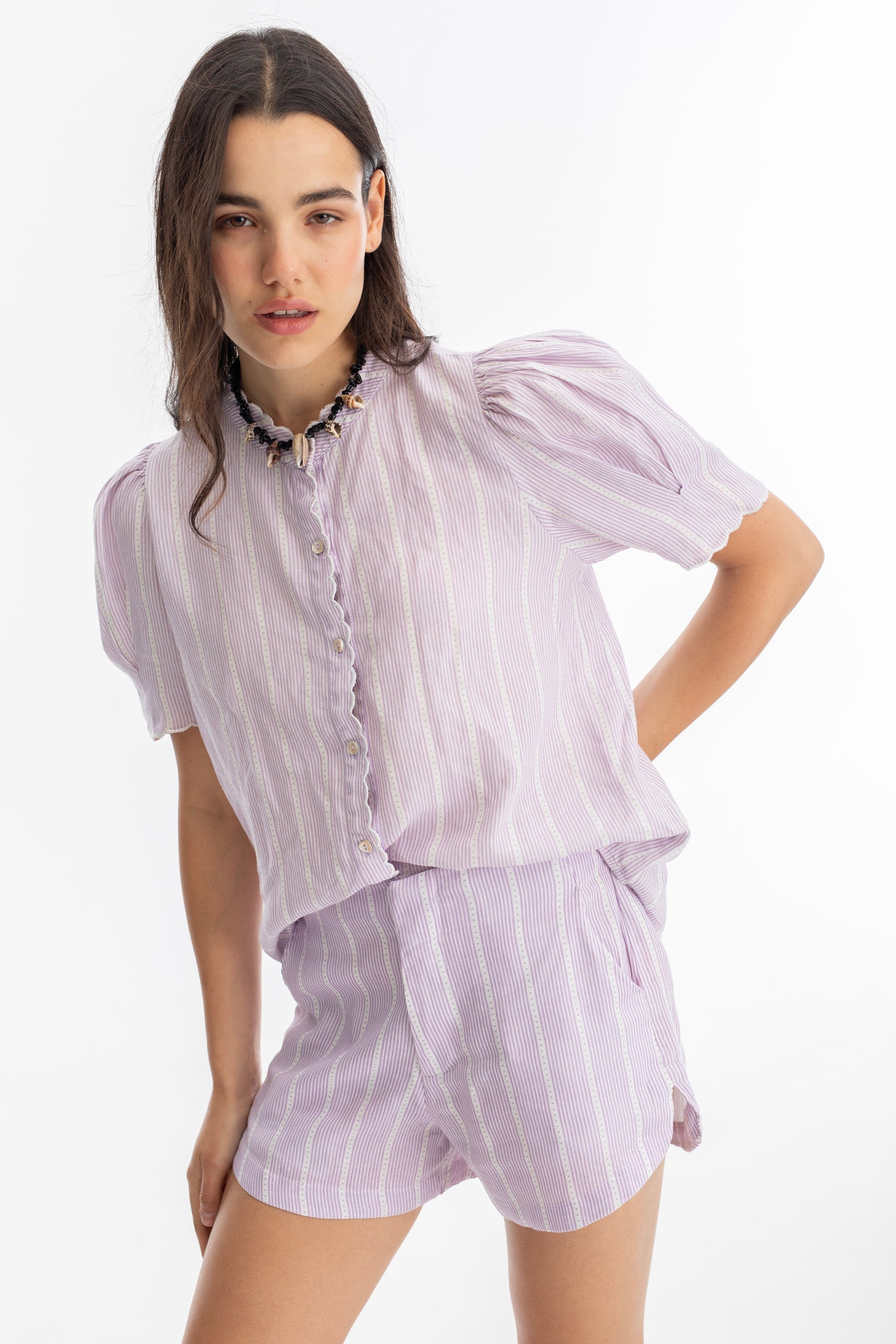 Flattering and flirty, this 100% natural linen shirt with embroidered details features puffed short sleeves, a minimalist mao neck and shell buttons on the front.