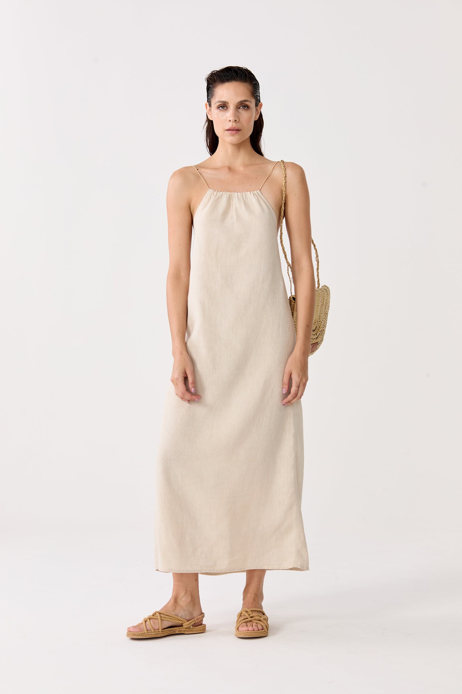 The Sophie Linen Dress is feminine and modern. Crafted from 100% natural linen —pre-washed and softened for a super easy handling— this sleeveless long dress features adjustable elastic spaghetti straps that make it comfortable and elegant. A subtle gathering at the back allows for more movement.