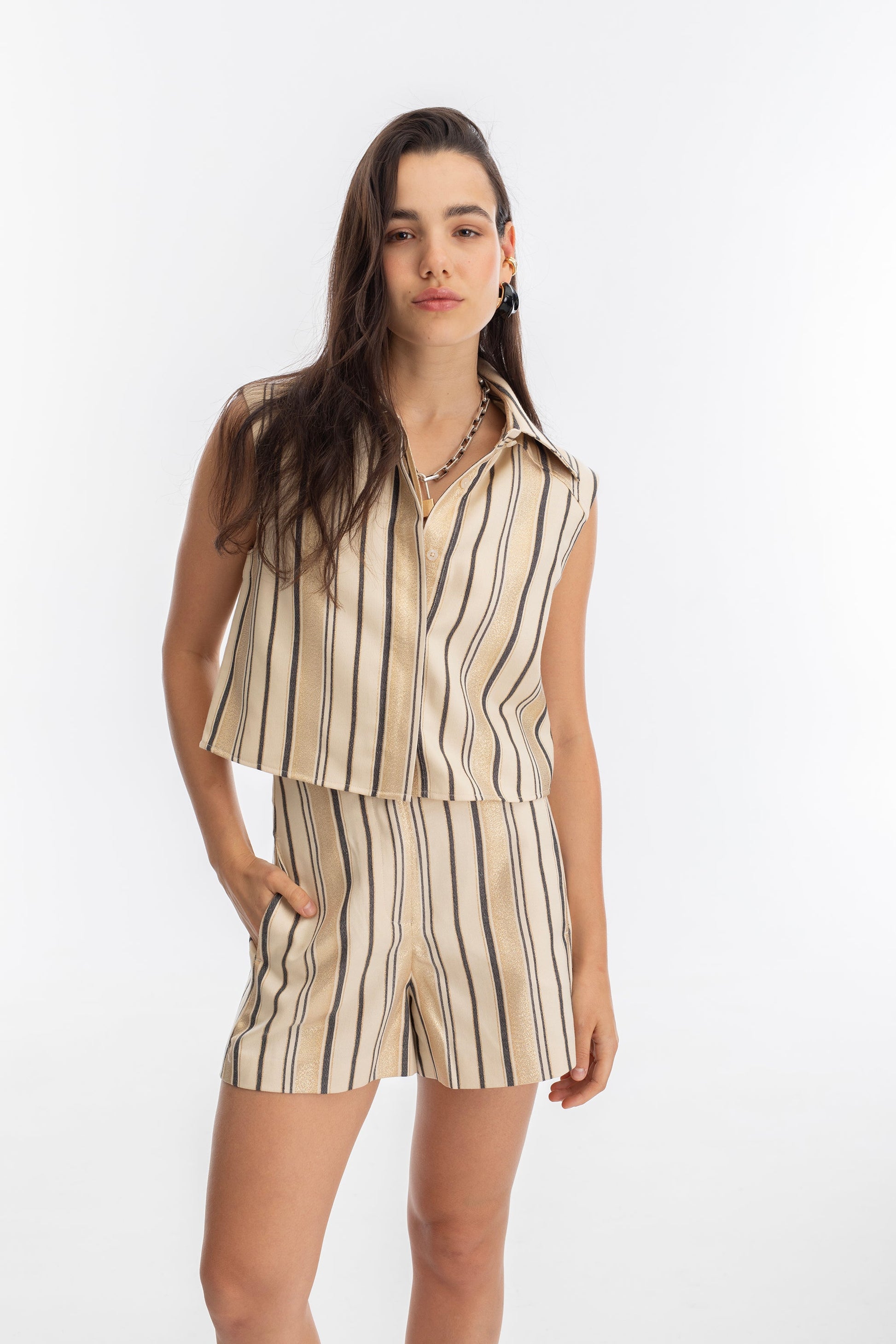 These high-waisted A-line shorts are super flattering and comfortable, and they have welt pockets on the back. They are made with a cotton blend jacquard with gold stripes, making them perfect for the holiday season.