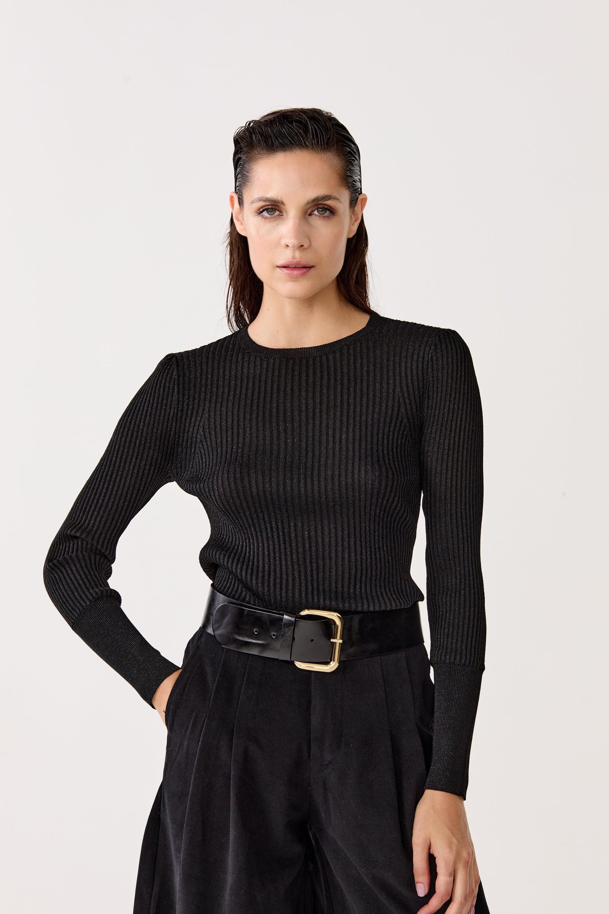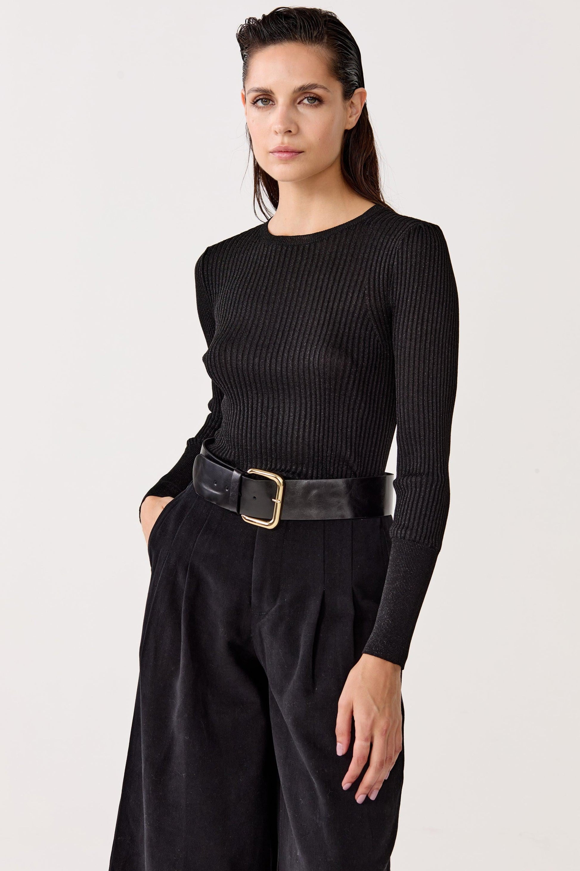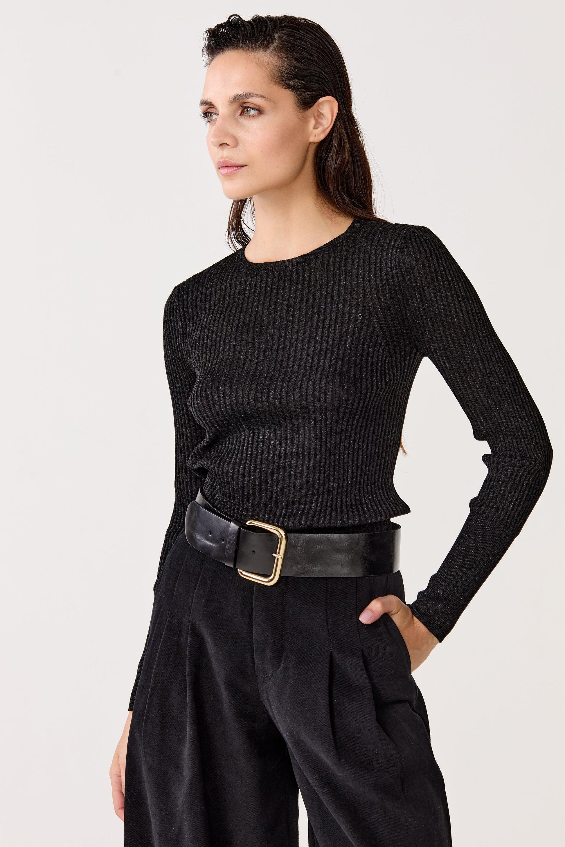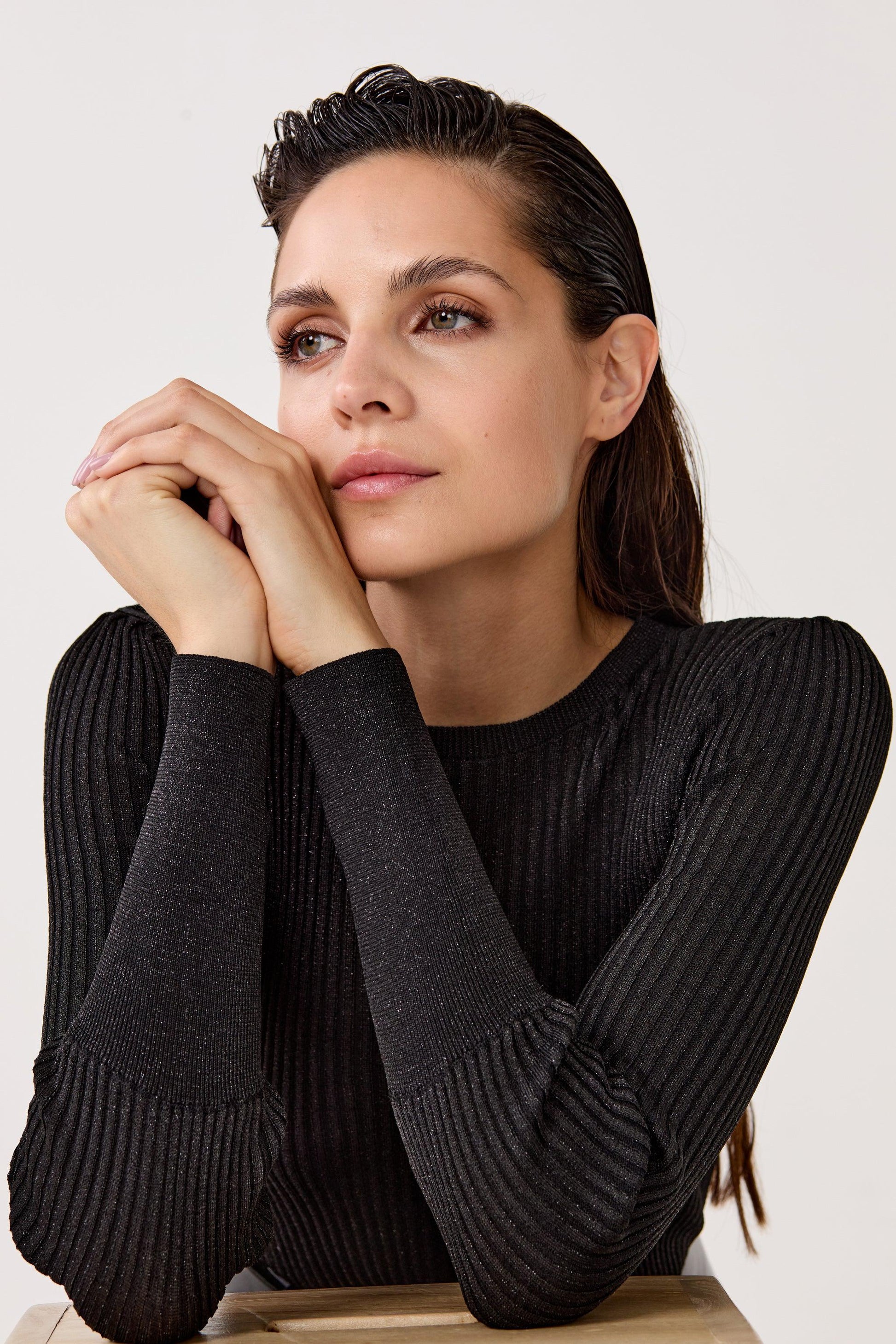 This crewneck top is cut for a close-to-the-skin fit. It is crafted with a ribbed knit from our favorite lurex thread for a shimmering finish and creates a body-hugging effect. This top will stun through all seasons.