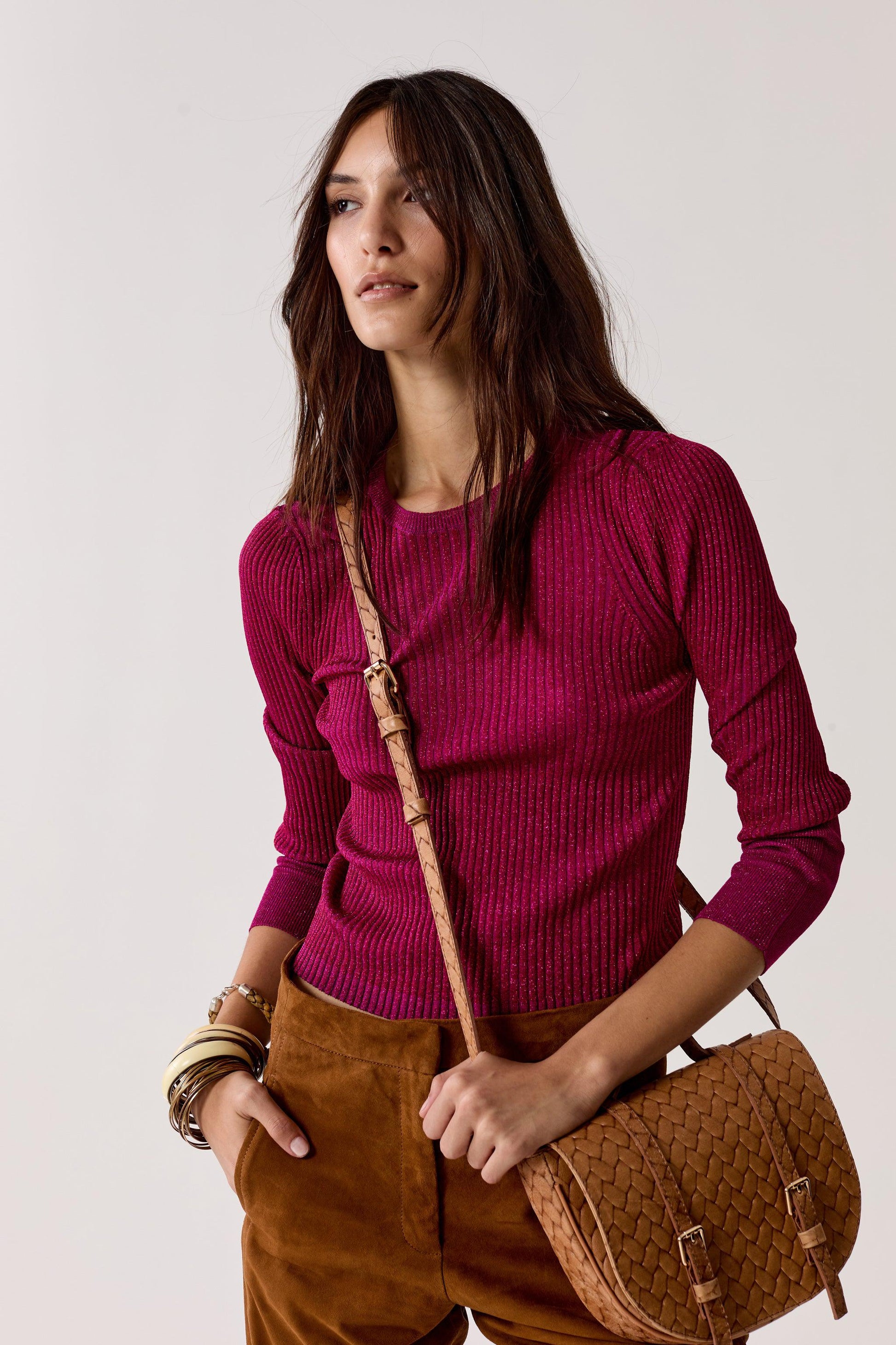 This crewneck top is cut for a close-to-the-skin fit. It is crafted with a ribbed knit from our favorite lurex thread for a shimmering finish and creates a body-hugging effect. This top will stun through all seasons.
